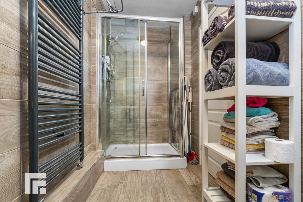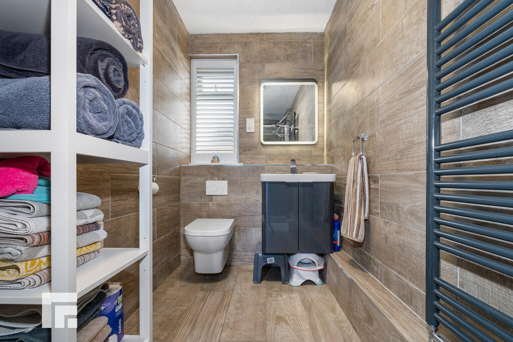 FAMILYSHOWERROOM11' 4" x 4' 9" (3.46m x 1.46m) Modern white suite comprising low level WC, vanity wash basin with storage below, large shower cubicle with twin head chrome shower. Quality wood plank effect tiled walls and floors. Electric shaver point. Obscured glass window. Heated towel rail.