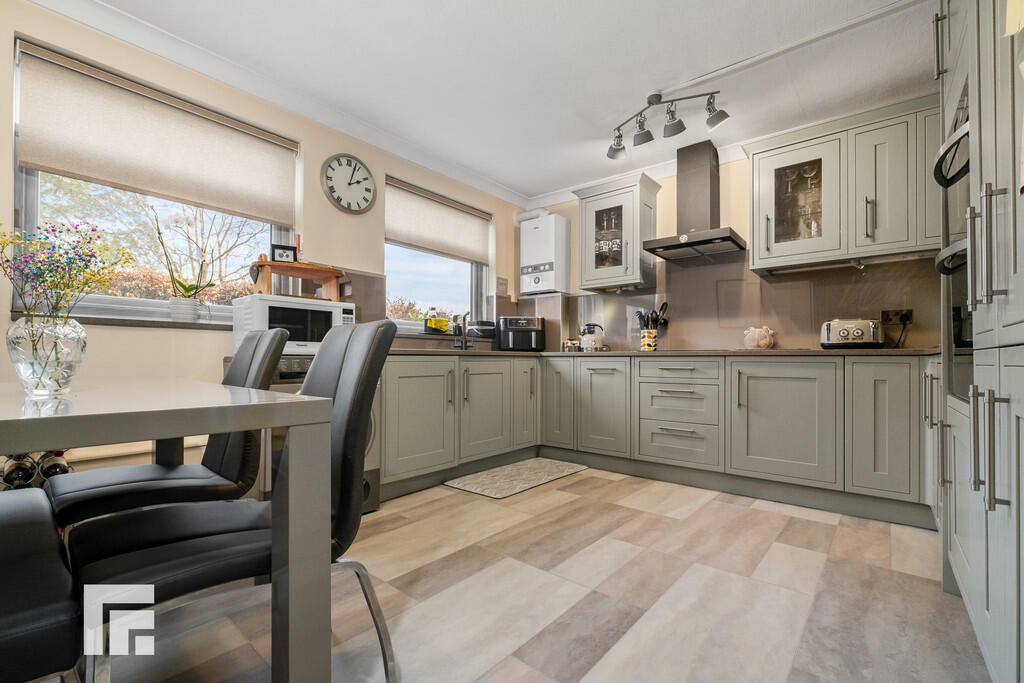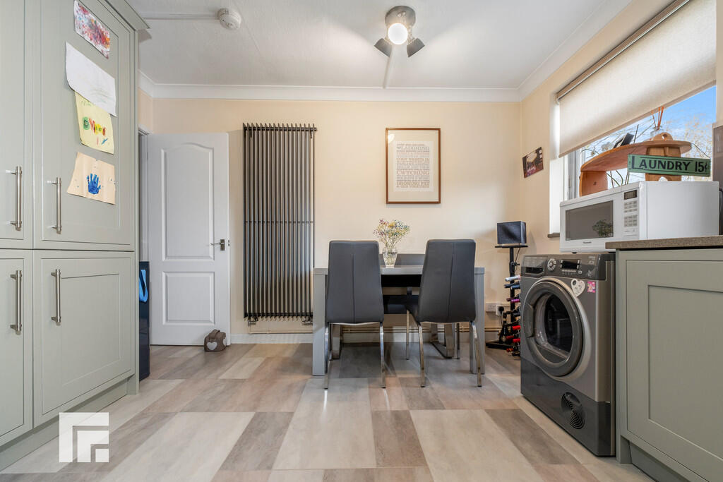 KITCHEN12' 11" x 11' 7" (3.96m x 3.55m) Well appointed along three sides in panelled fronts with chrome bar handles beneath quartz worktop surfaces. Inset stainless steel sink with work top side drainer. Inset four ring 'Neff' induction hob with cooker hood above. Integrated 'Zanussi' oven and grill. Integrated washing machine. Integrated slim line dishwasher. Integrated fridge freezer. Matching range of eye level wall cupboards. Two windows overlooking the communal garden. Aluminium 'Mushroom' coloured splash back. Wall mounted 'ideal' combi gas central heating boiler with 'Hive' thermostat. Ample space for family dining table. Vertical radiator. Amtico flooring.