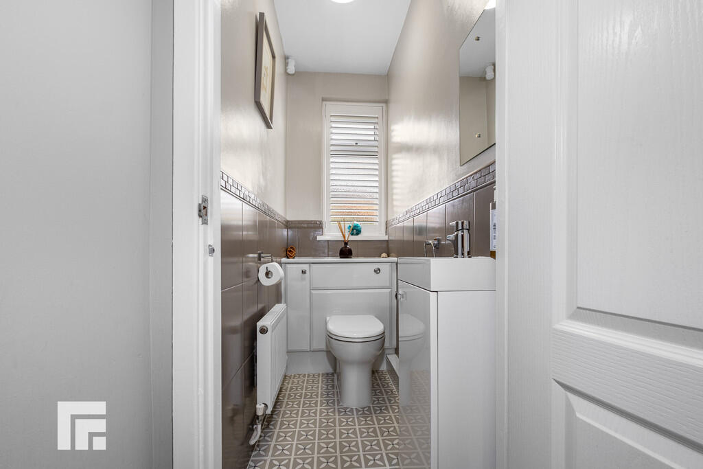 CLOAKROOM White suite comprising low level wc, vanity wash basin with storage below. Wall tiling to half height. Obscured glass window. Radiator.