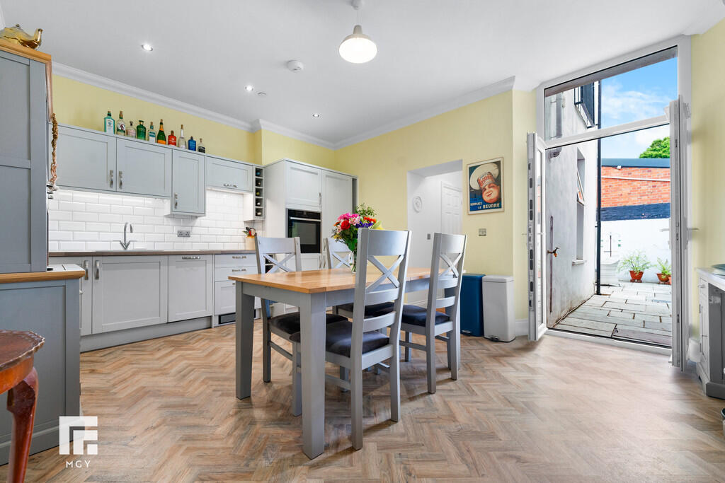 KITCHEN/DINER16' 11" x 12' 7" (5.18m x 3.86m) Modern fitted kitchen with a range of wall, base and drawer units with worktops over incorporating inset sink with hot and cold tap over and induction hob with extractor above. Integrated appliances such as dishwasher, fridge/freezer and electric oven. Spotlights and pendant lighting. Tiled splashback. Power points. Double glazed French doors leading to rear garden. Doors to bedroom two, bathroom and two storage cupboards - one housing boiler.