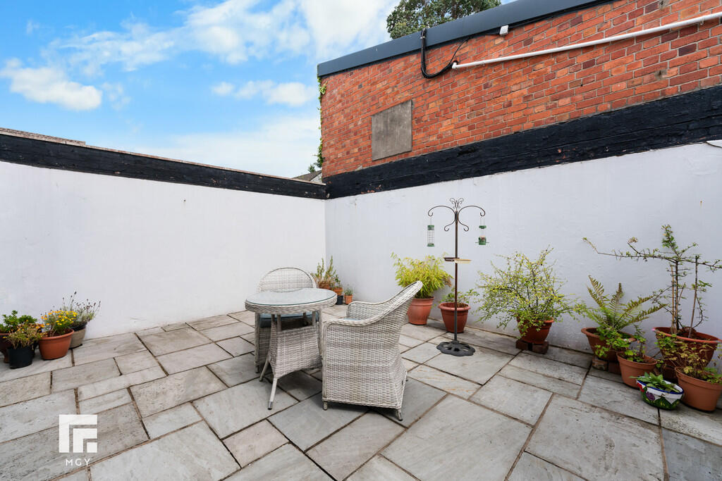 Rear - Private rear yard. Laid to patio. Fence border. Gate. Accessed via kitchen/diner and bedroom two.