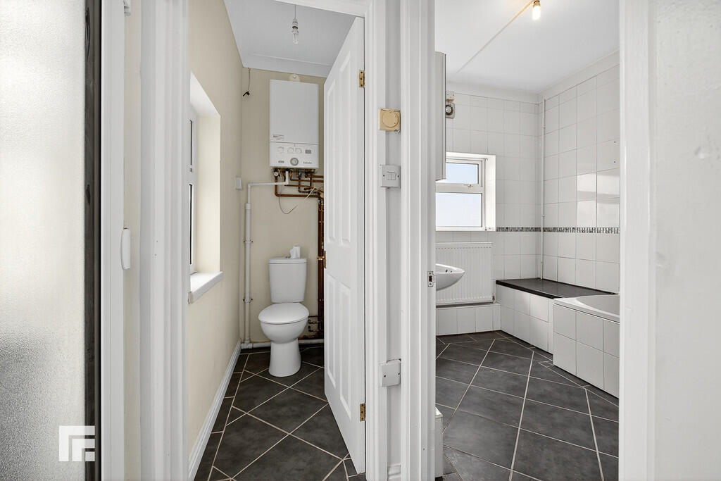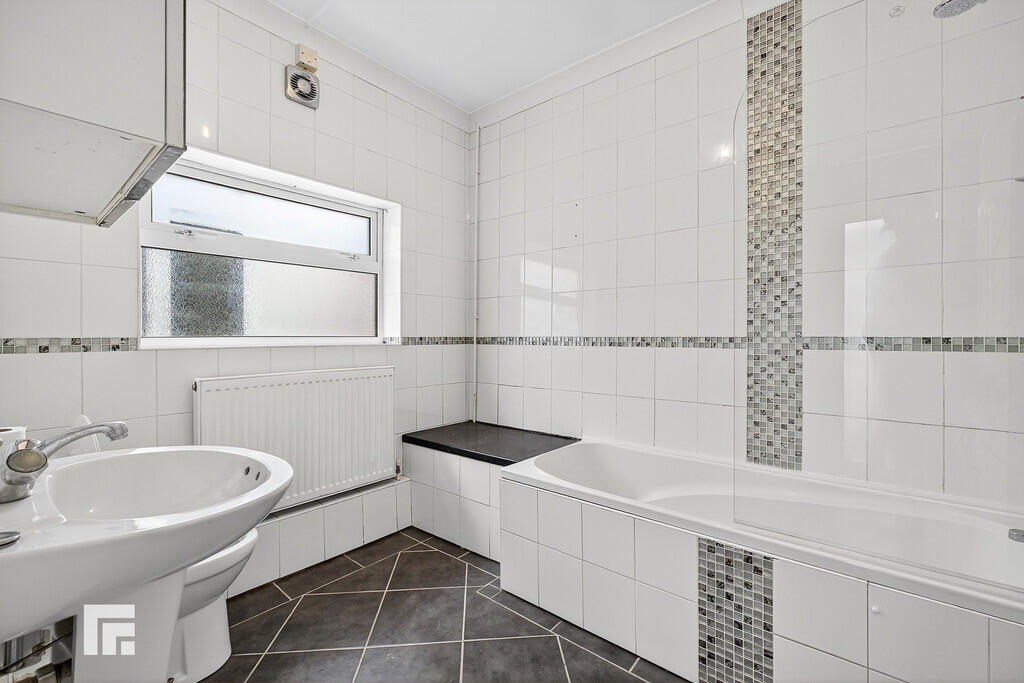 BATHROOM8' 11" x 6' 11" (2.74m x 2.11m) Three piece bathroom suite comprising panelled bath with mixer tap over and separate mains shower fixture, pedestal wash hand basin with wall mounted mirror over, and WC. Fully tiled walls and flooring. Extractor fan. Radiator.