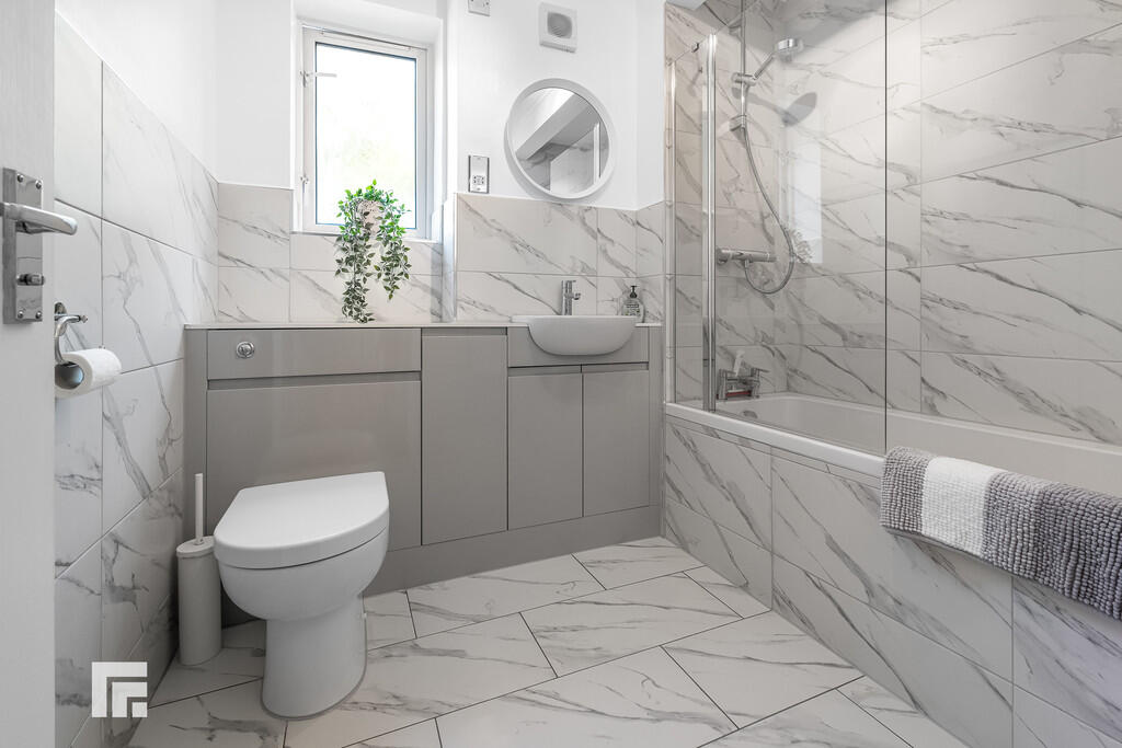 BATHROOM7' 10" x 6' 6" (2.4m x 2.0m) New modernised bathroom with obscure double glazed uPVC window to rear. Fully tiled walls and flooring. Tile panelled bath with mains powered shower over and glass shower screen. Wall mounted vanity wash hand basin with storage underneath. W.C. Extractor fan. Shaver point. Large chrome towel radiator.