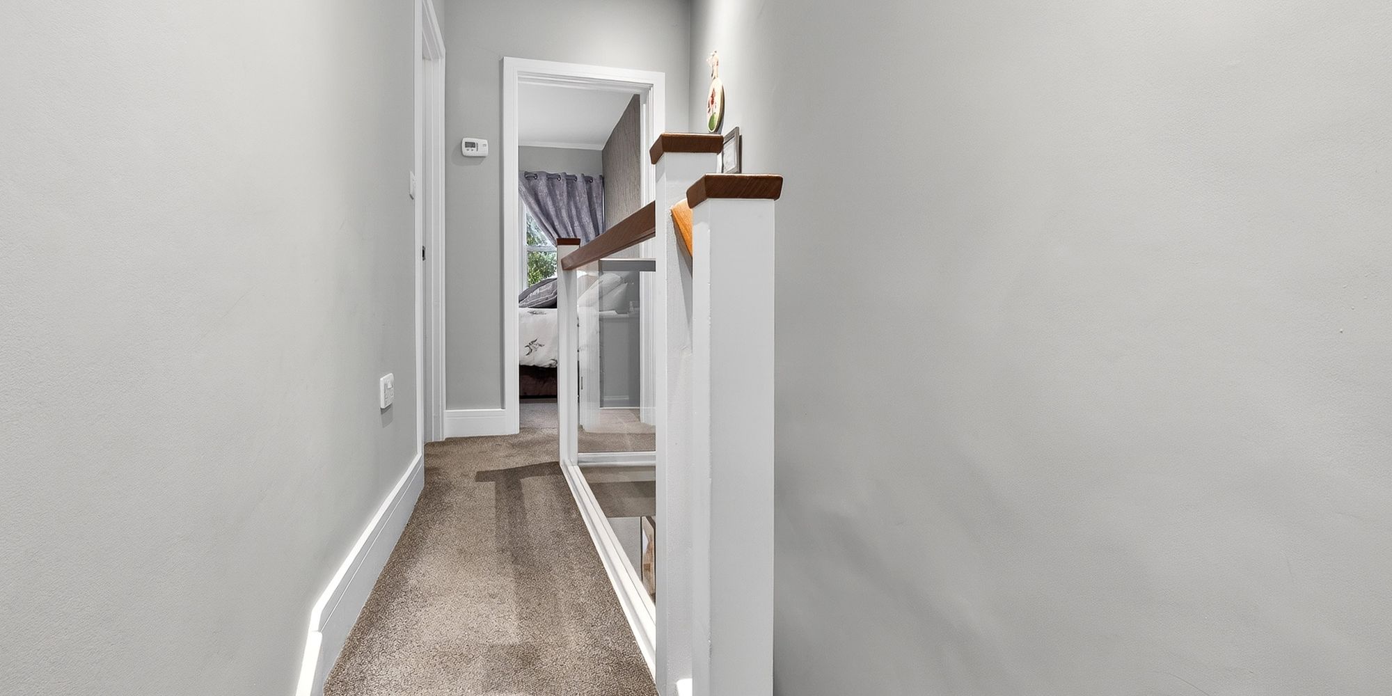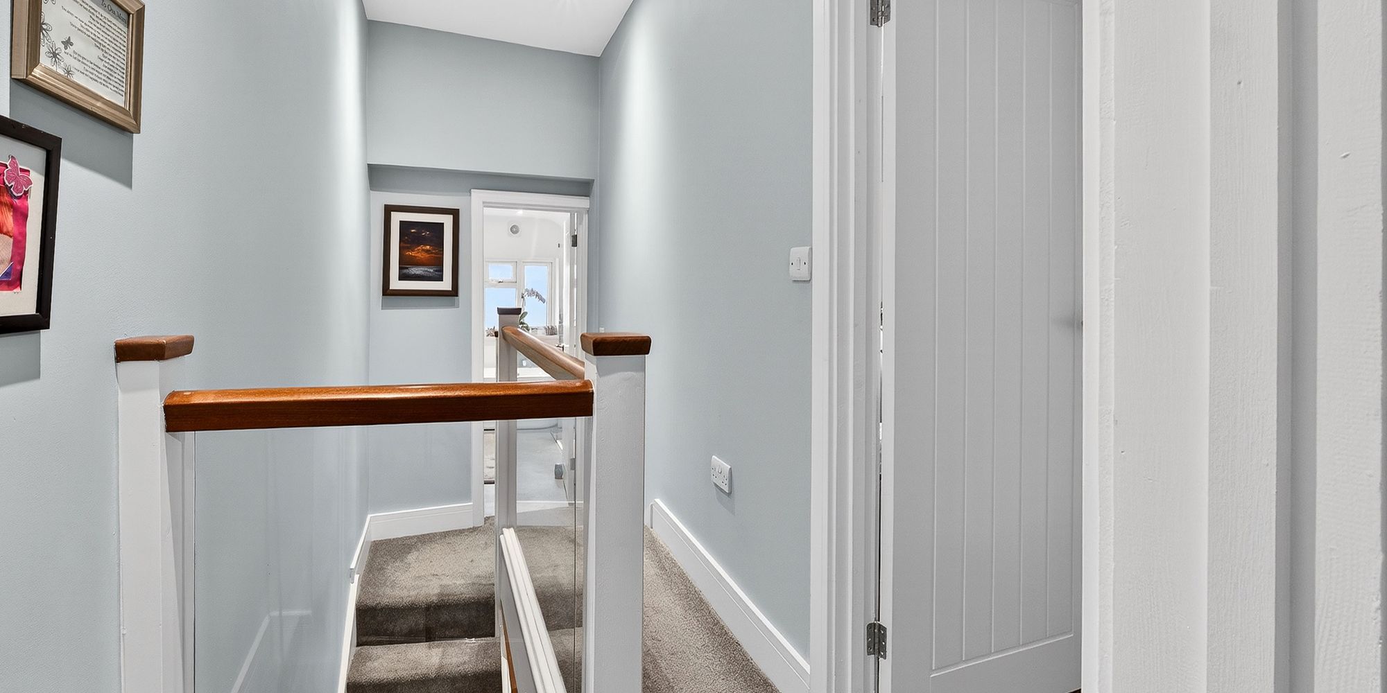 FIRST FLOOR LANDING Split level landing with glass balustrades. Doors to two bedrooms and bathroom. Carpeted flooring. Loft hatch.