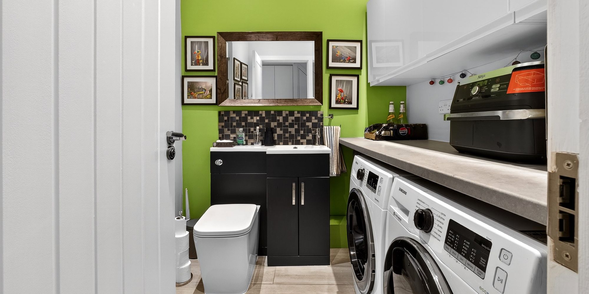 UTILITY ROOM/WC Space and plumbing for washing machine and dryer, with fitted cupboards across one wall. Vanity wash hand basin with mixer tap. WC. LVT flooring with underfloor heating. Spotlights.