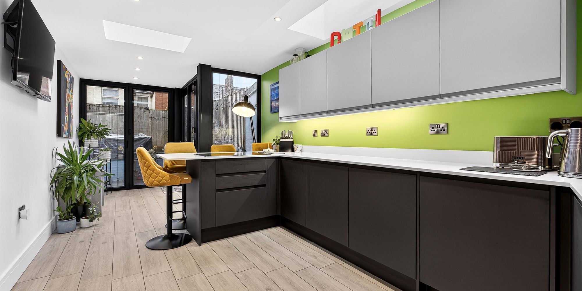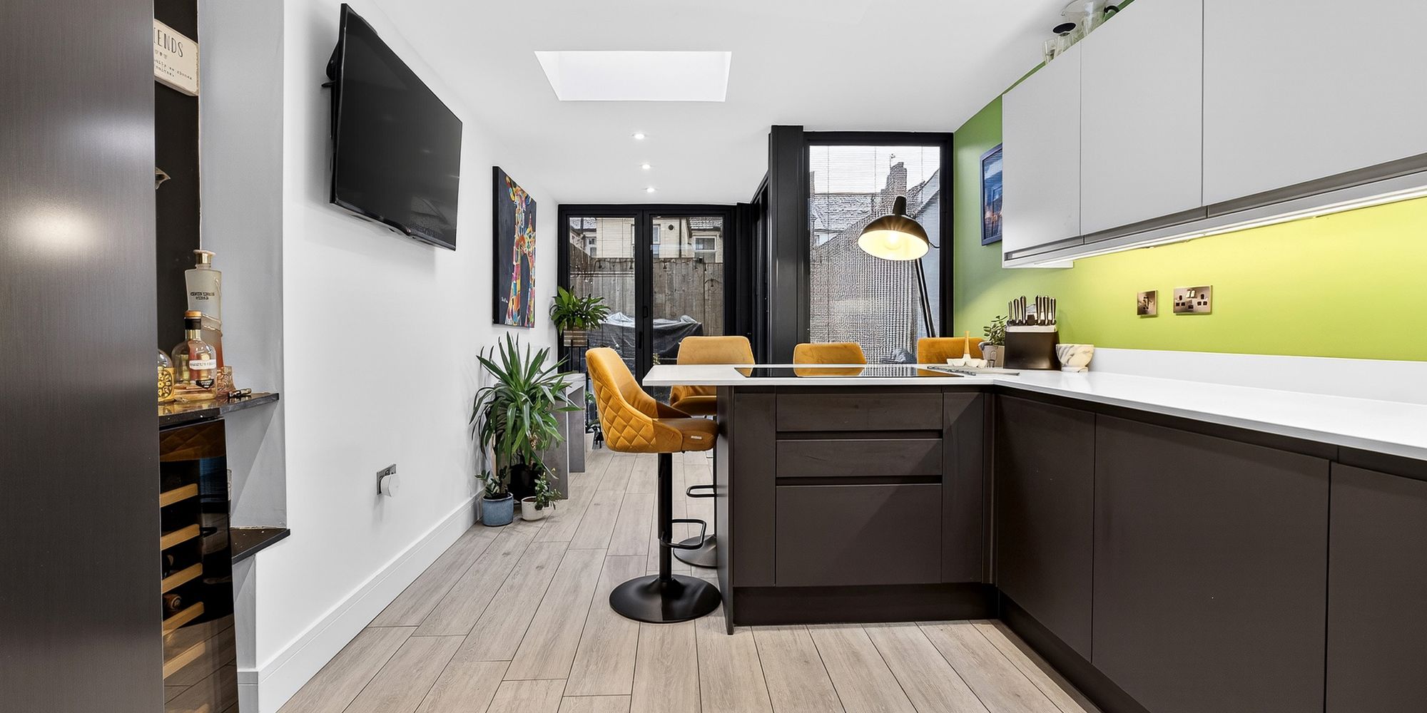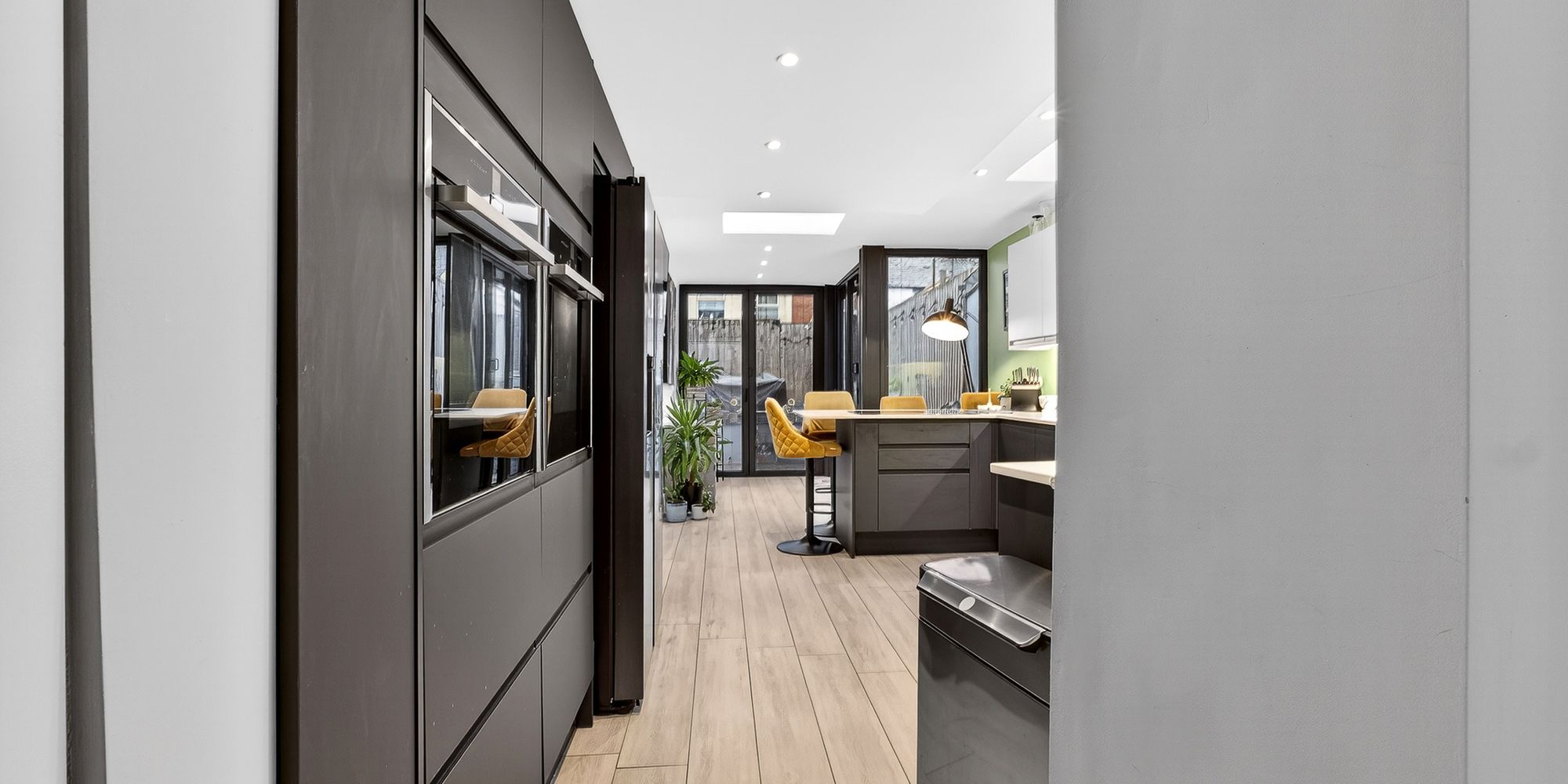 KITCHEN/BREAKFAST ROOM Modern fitted kitchen with a range of wall, base and drawer units with Quartz worktops over incorporating inset double sink and drainer with mixer tap over and induction hob. Breakfast area with storage beneath and space for stool seating. Integrated double Neff oven and dishwasher. Space for American fridge/freezer. Skylights. Spotlights. LVT flooring with underfloor heating. Double glazed Bifold doors with internal blinds, leading to private rear garden.