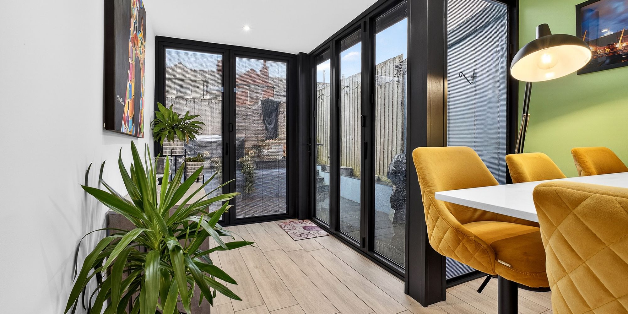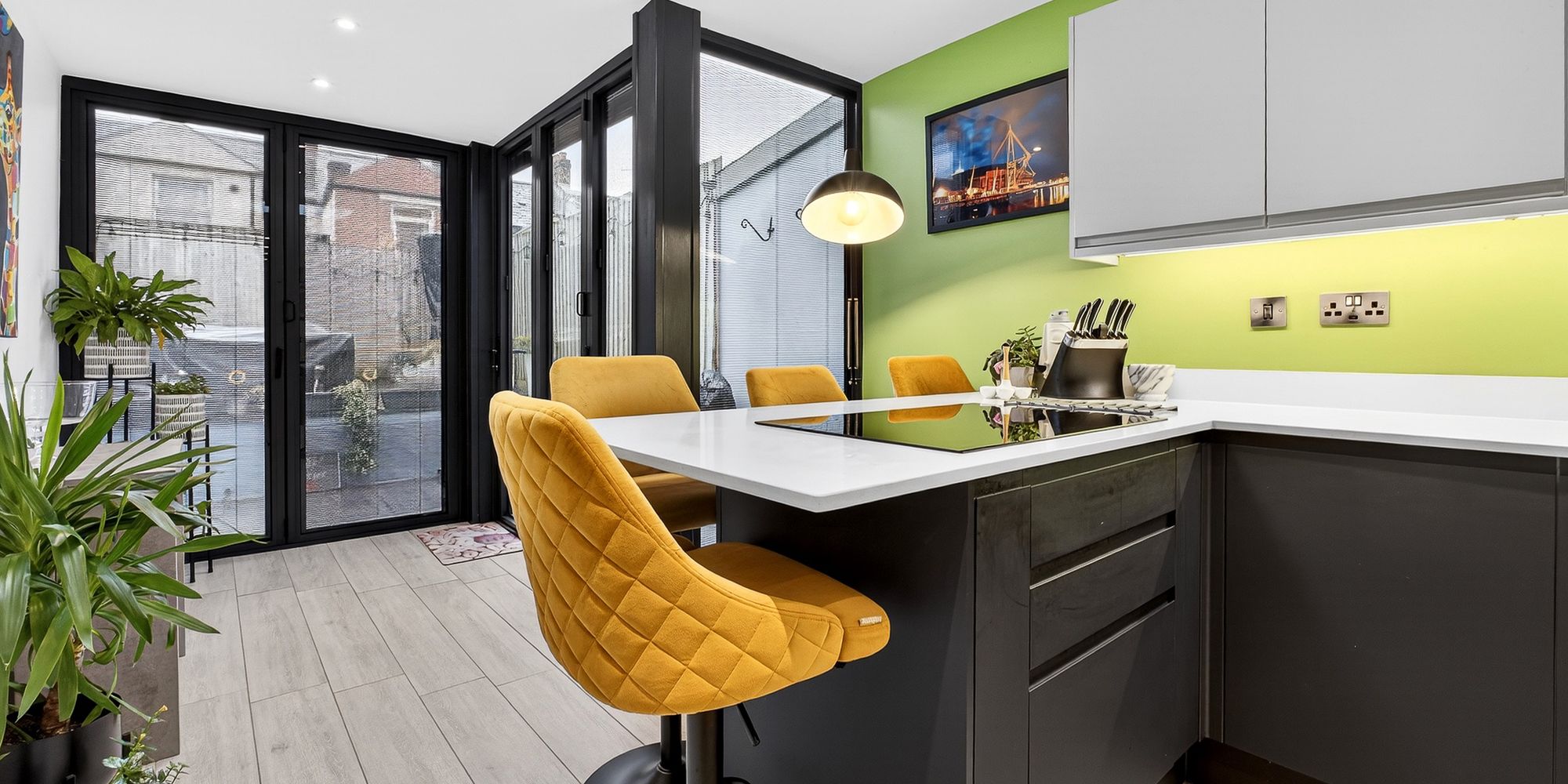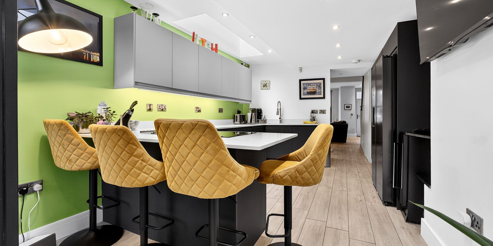 KITCHEN/BREAKFAST ROOM Modern fitted kitchen with a range of wall, base and drawer units with Quartz worktops over incorporating inset double sink and drainer with mixer tap over and induction hob. Breakfast area with storage beneath and space for stool seating. Integrated double Neff oven and dishwasher. Space for American fridge/freezer. Skylights. Spotlights. LVT flooring with underfloor heating. Double glazed Bifold doors with internal blinds, leading to private rear garden.