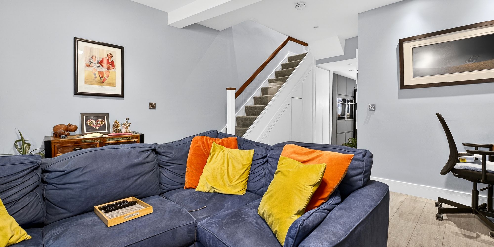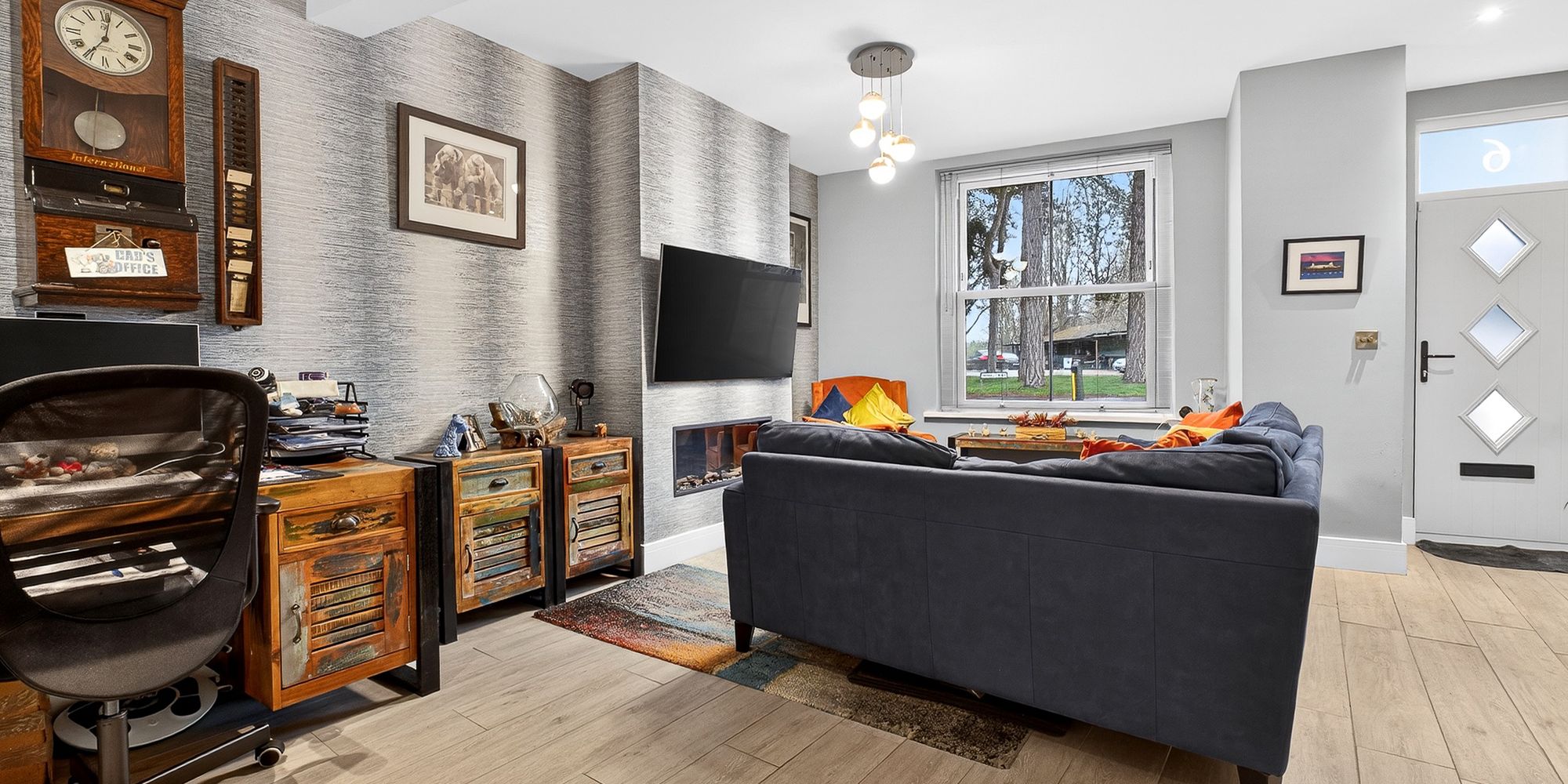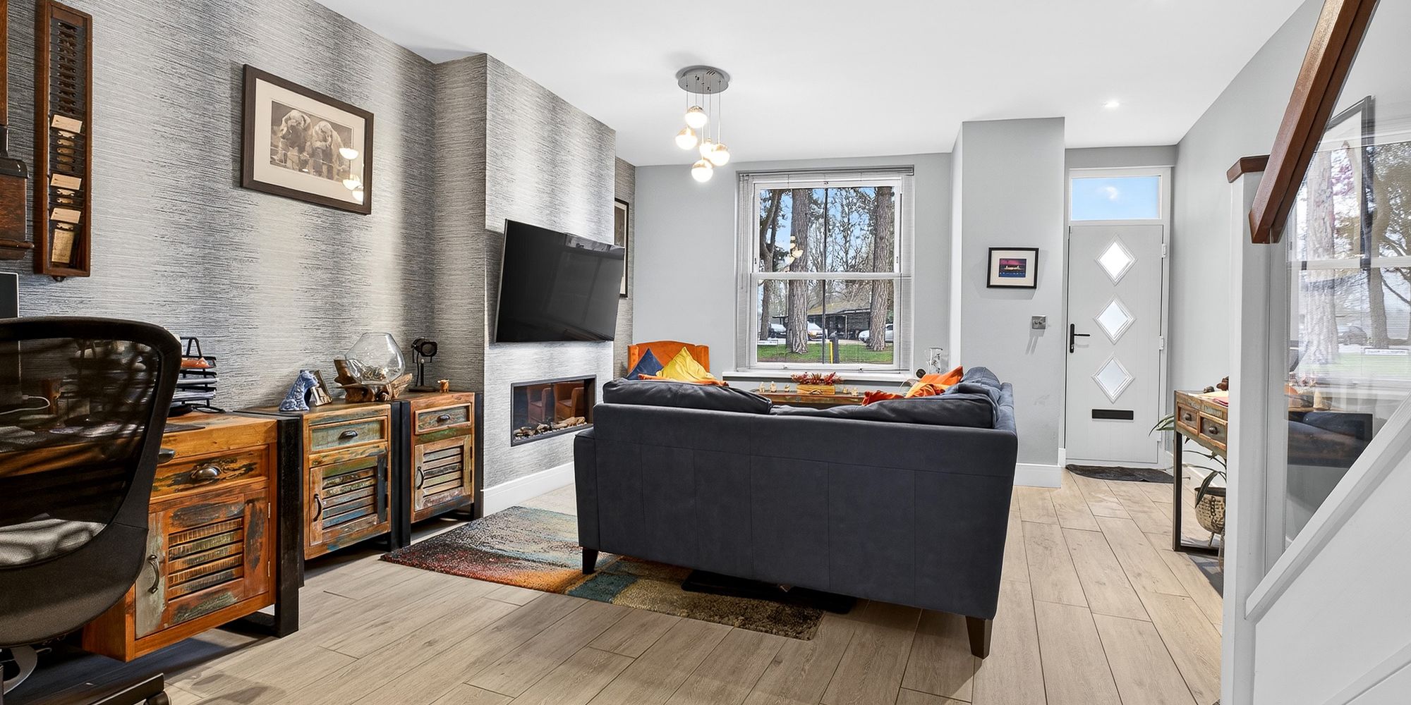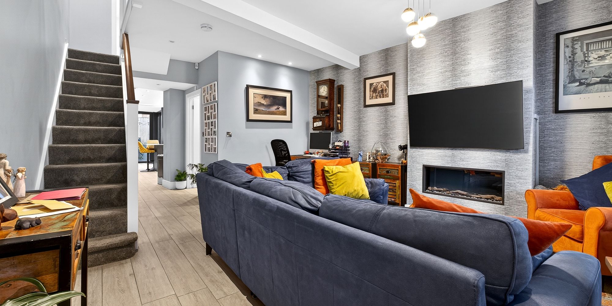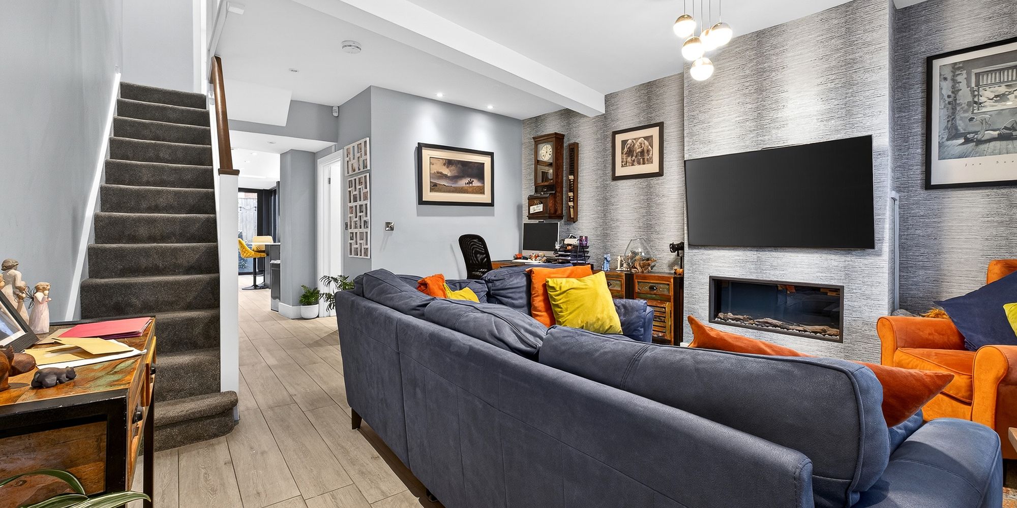 LOUNGE Double glazed sash window to front aspect with fitted blinds. Continuation of LVT flooring underfloor heating. Pendant light fitting and spotlights. Alcoves with inset fireplace. Stairs rising to first floor with ample under stair storage.
