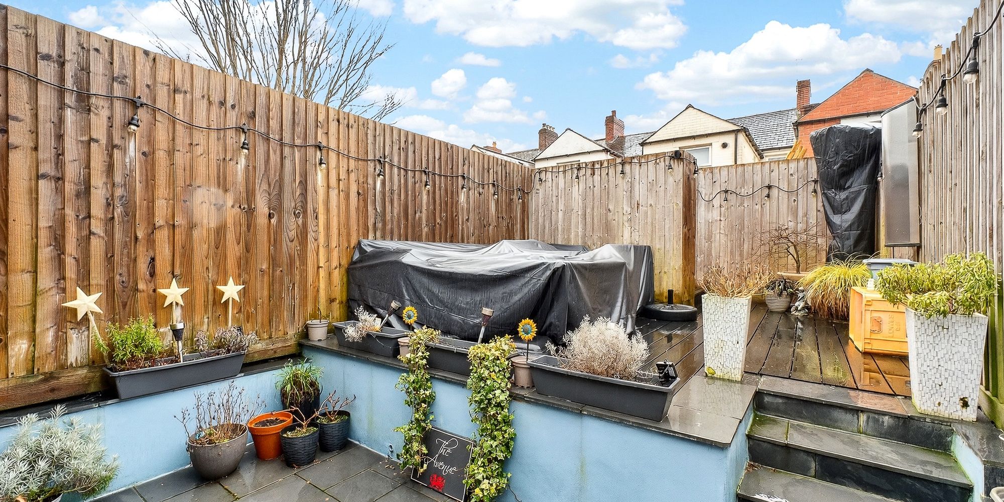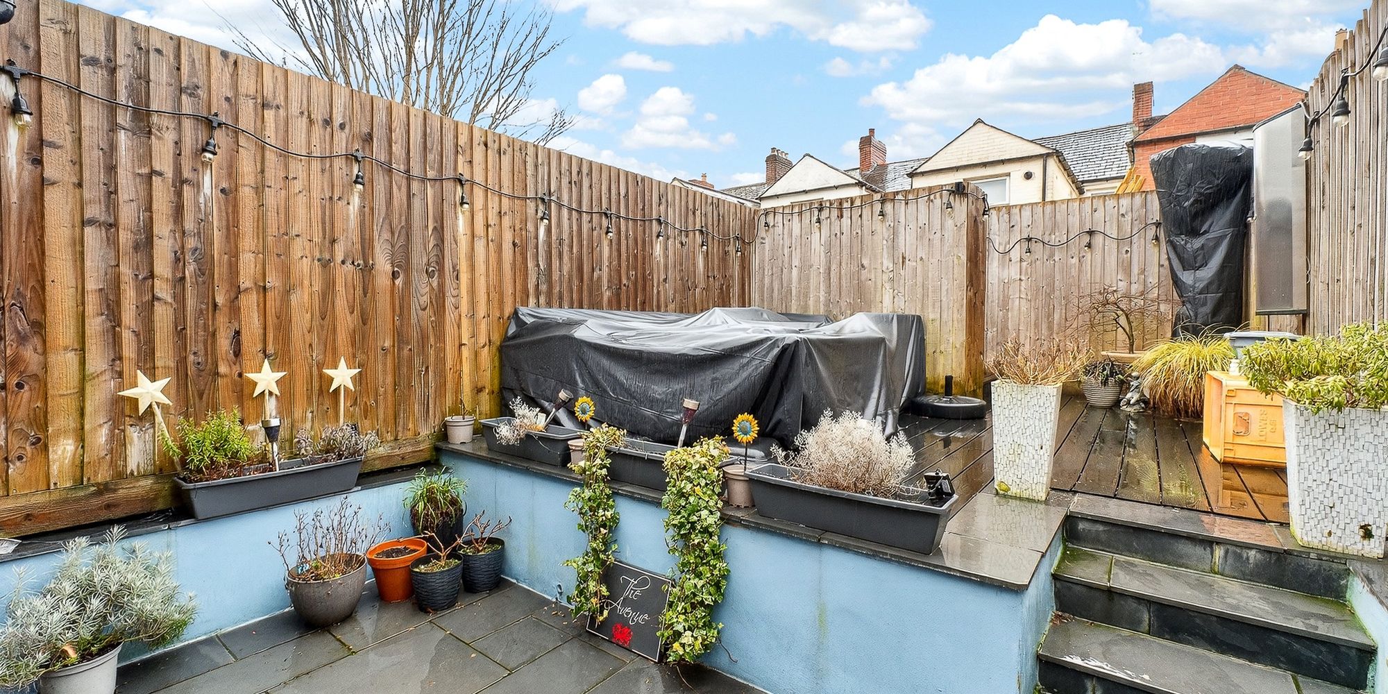 OUTSIDE Private South facing rear garden split over two levels. Partly paved with stairs leading to decked areas. Fenced borders. Outside tap.