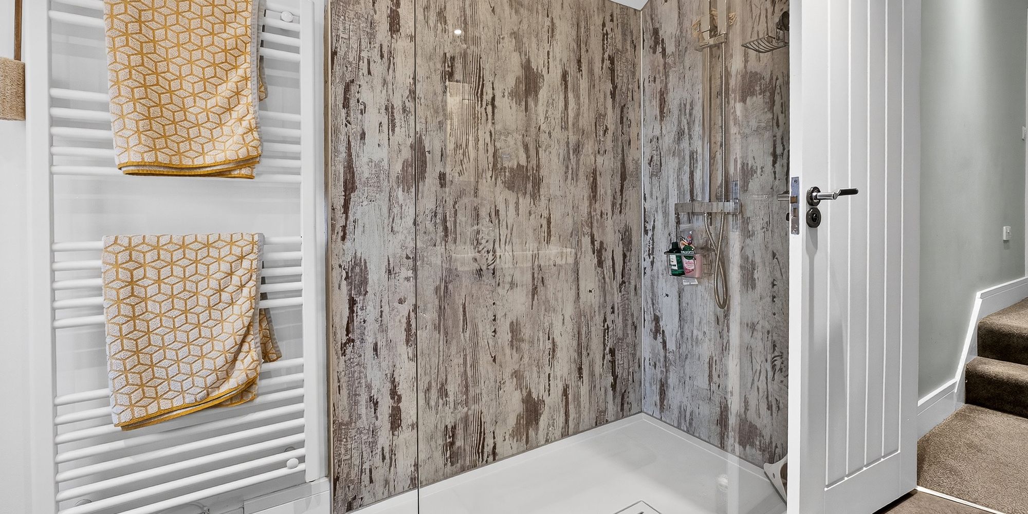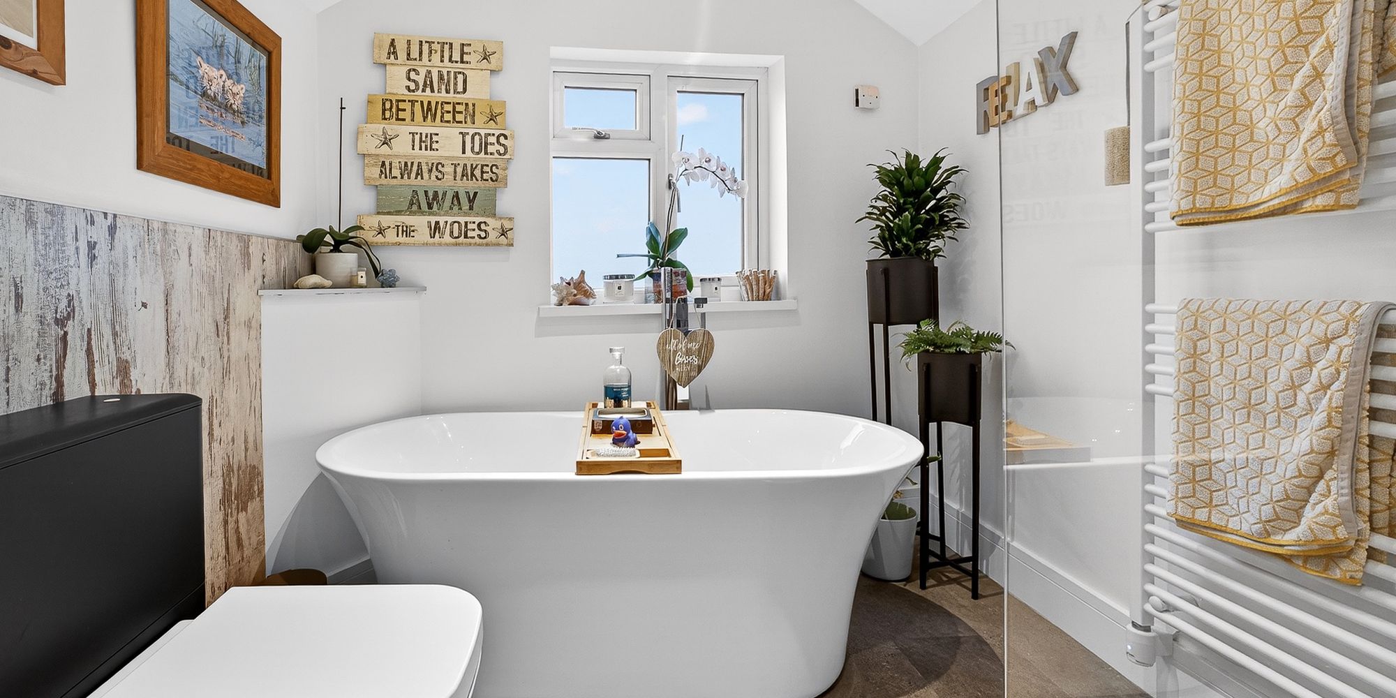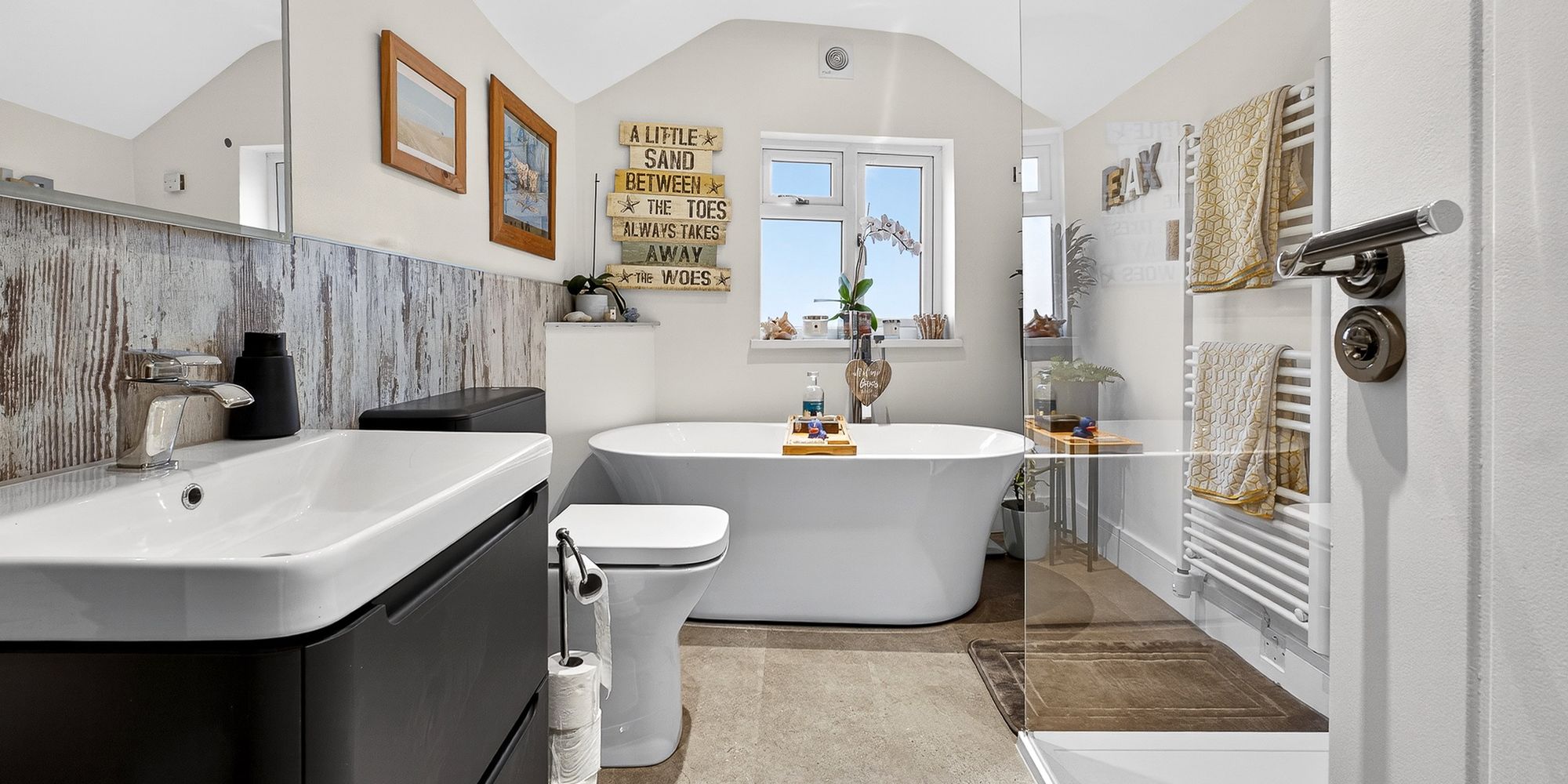 BATHROOM Obscure double glazed window to rear aspect. Walk in shower with mains powered drench shower over and additional handheld attachment. Free standing bath with mixer tap over. Vanity wash hand basin with mixer tap above and storage beneath. WC. Spotlights. Extractor fan. Partly tiled walls. Laminated marine plywood flooring. Heated towel rail.