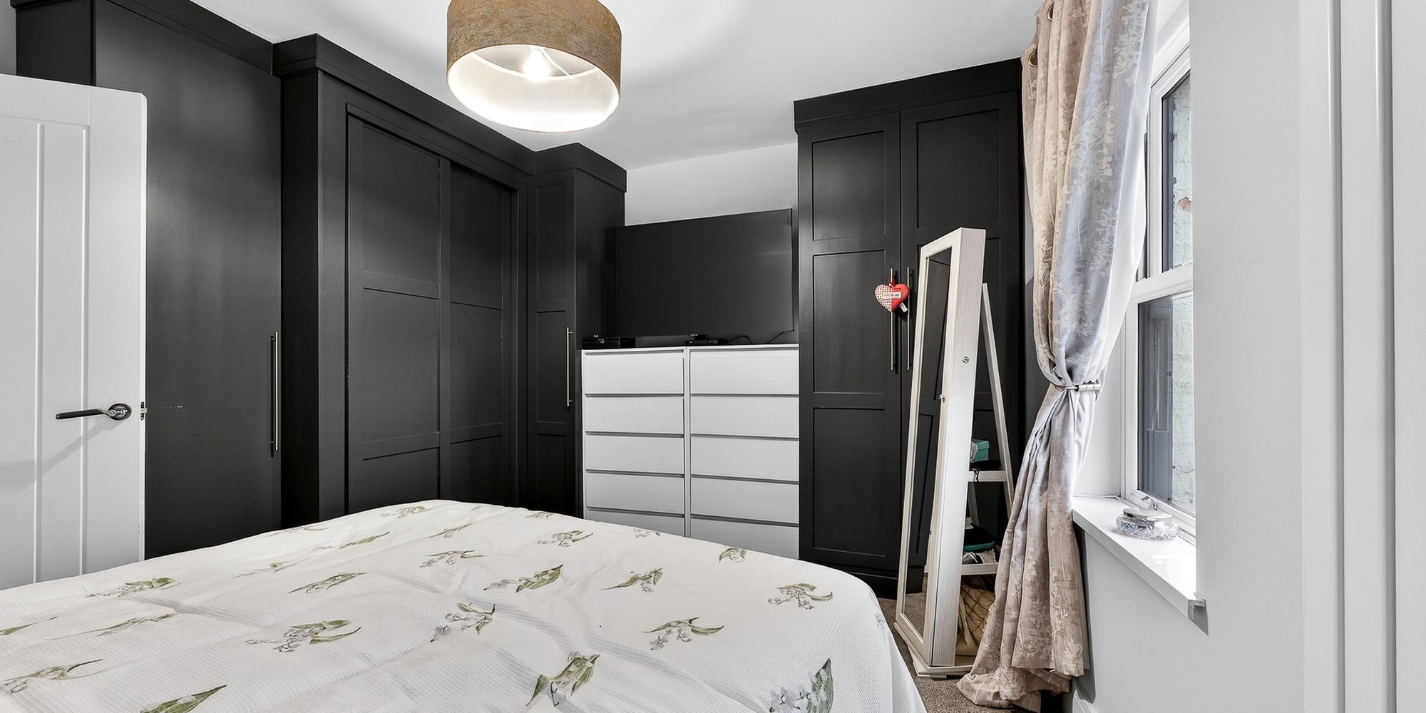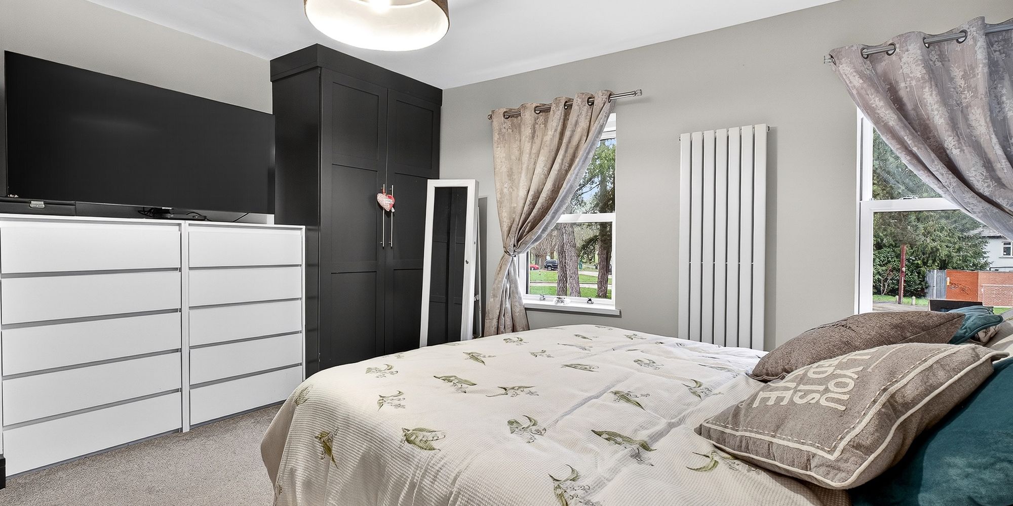 BEDROOM ONE Located at the front of the house. Two double glazed sash windows to front aspect. Double bedroom. Fitted wardrobes. Carpeted flooring. Vertical radiator. Pendant light fitting.