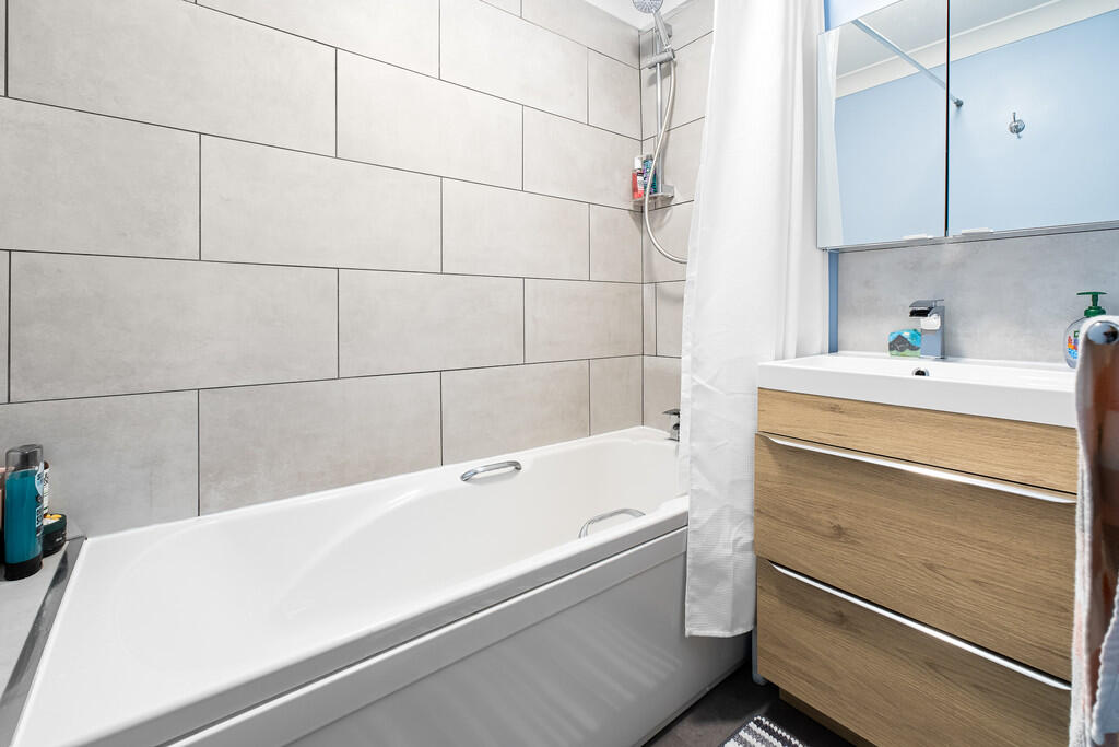 BATHROOM Part tiled walls and vinyl flooring. Suite comprising panelled bath with shower, vanity unit with inset wash hand basin. Coved ceiling. Extractor fan and towel rail.