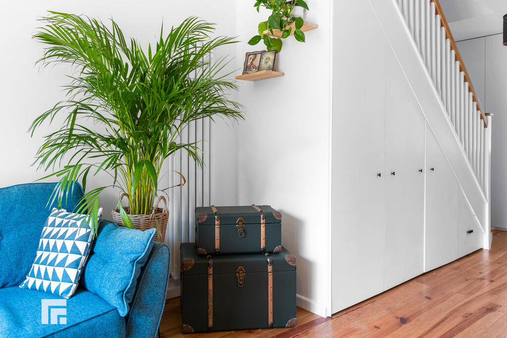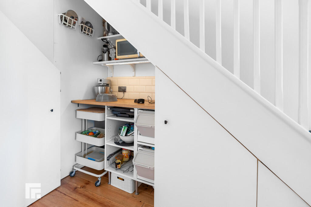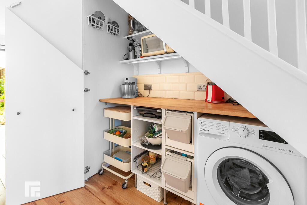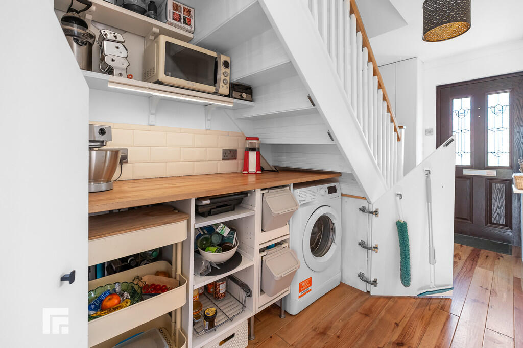 UNDER-STAIRSCUPBOARD A concealed cupboard with folding doors opening to a further wooden worktop/ kitchen area. Storage shelves. Tiled splashbacks. Plumbing for washing machine. Wine Rack. Tap to switch on outside water supply. Under storage units. Light. Pull out draw with bins for recycling.