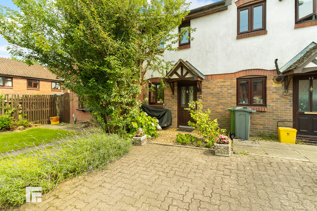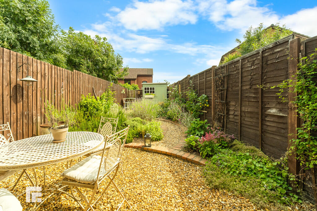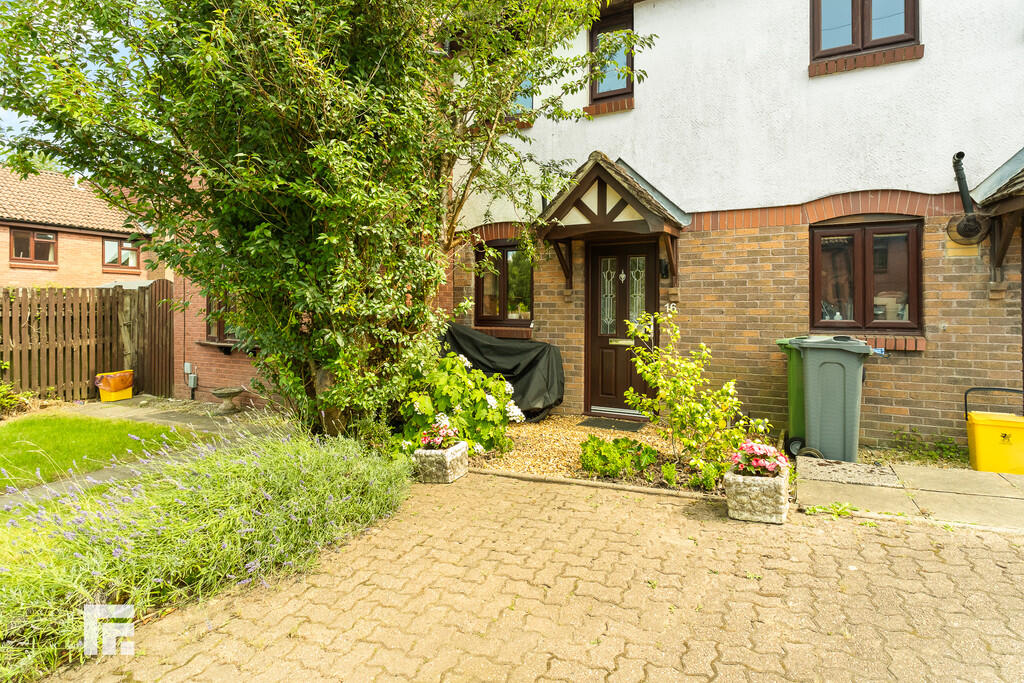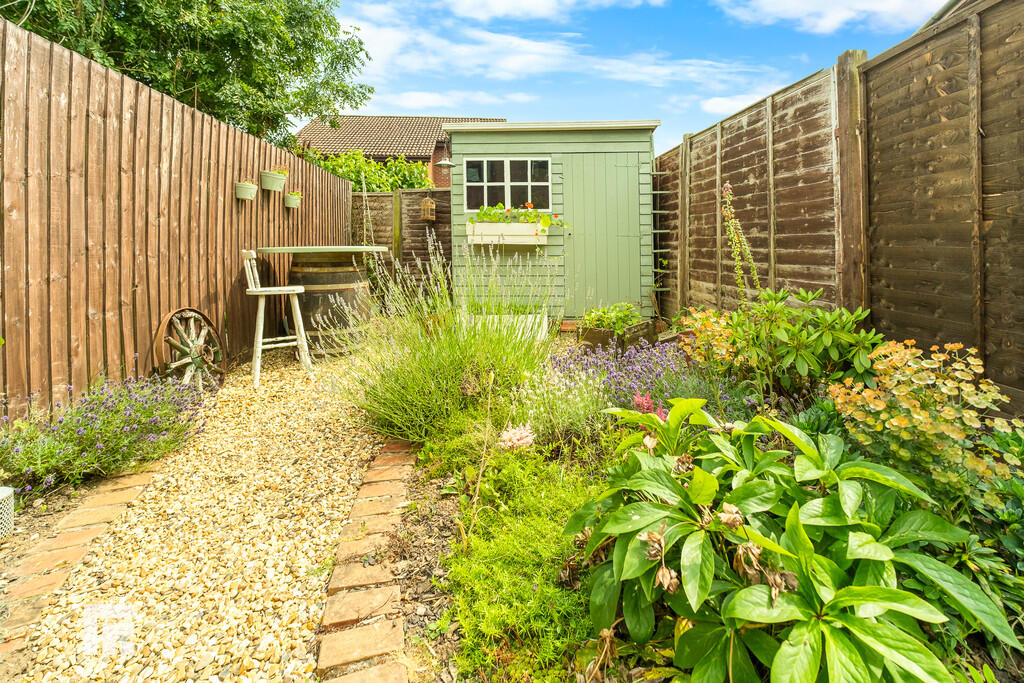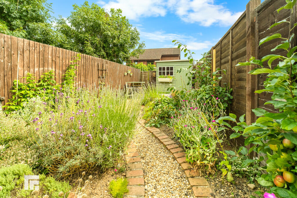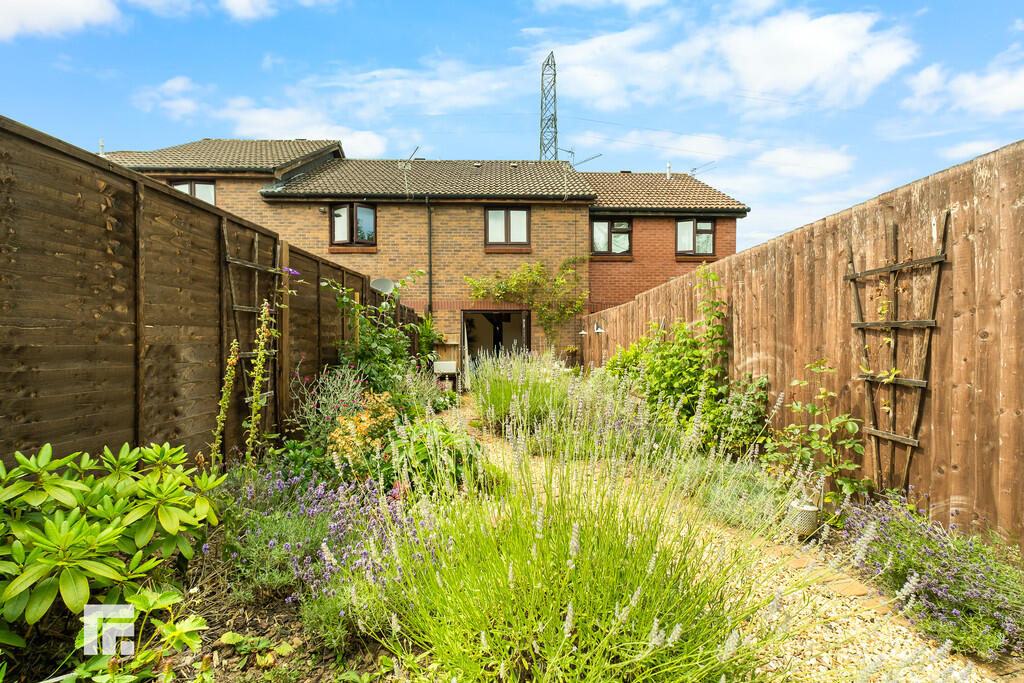 FRONT Block paved driveway with parking for one vehicle. Lavender and spring bulbs planted to one side. Stone area leading to front door.