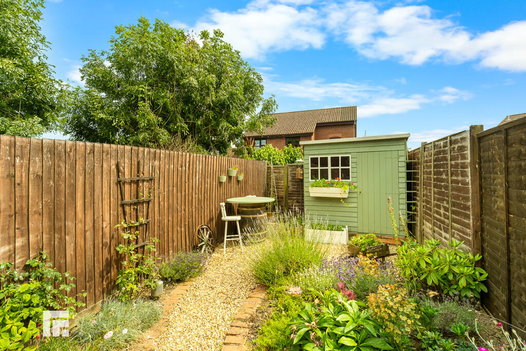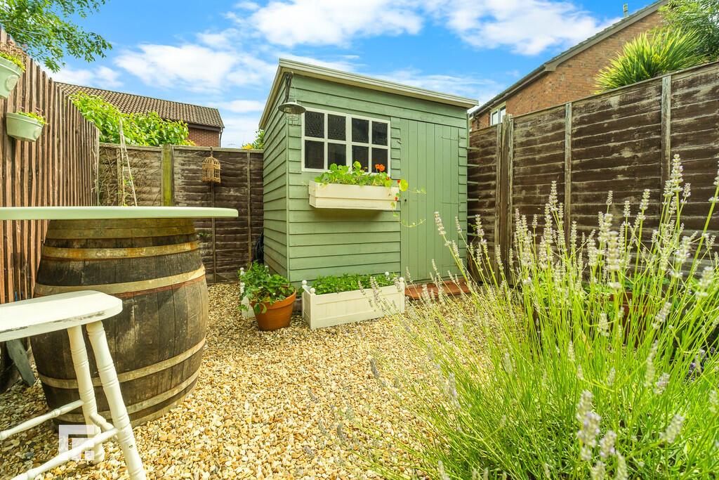 REARGARDEN Bordered by a timber fence, a beautifully landscaped, well maintained rear garden. 'Belfast' sink with outside tap on a stoned area leading to pathway with brick border; surrounded by mature plants and shrubs. Area of edible plants such as Rosemary, Thyme and basil leading to raspberry, apple and plum trees. Timber shed. Space for outside dining. Outside power socket.
