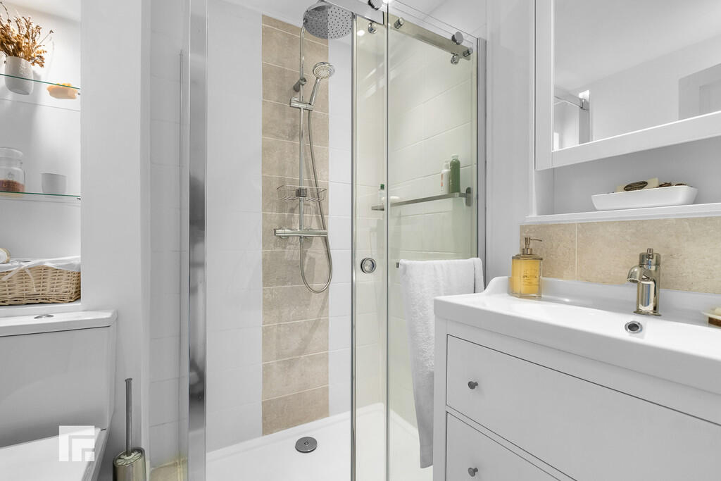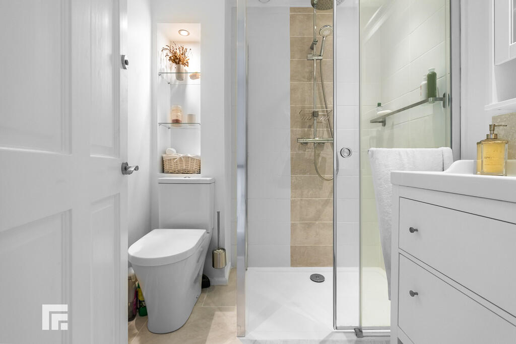 SHOWERROOM6' 2" x 5' 8" (1.88m x 1.75m) Modern white suite; low level WC, wash hand basin with chrome mixer tap and vanity, mirrored wall cupboard, walk in shower with glass sliding door and dual headed chrome shower. Tiled splashbacks. Tiled flooring. Spotlights. Extractor fan. Chrome heated towel rail. Built in shelving unit with spotlight.