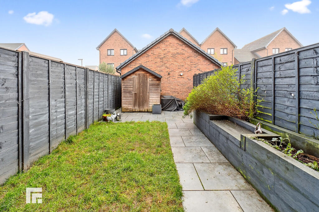 GARDEN A generous, fully enclosed rear garden, bordered by well-maintained timber fencing and benefiting from a convenient rear access gate. From the lounge/diner, French doors open onto an initial patio area. To the left is a lawn, while to the right are flower beds with well established plants and flowers. A path leads to the end of the garden where there is a further patio area, ideal for al-fresco dining or relaxing in the sun, along with a handy storage shed.