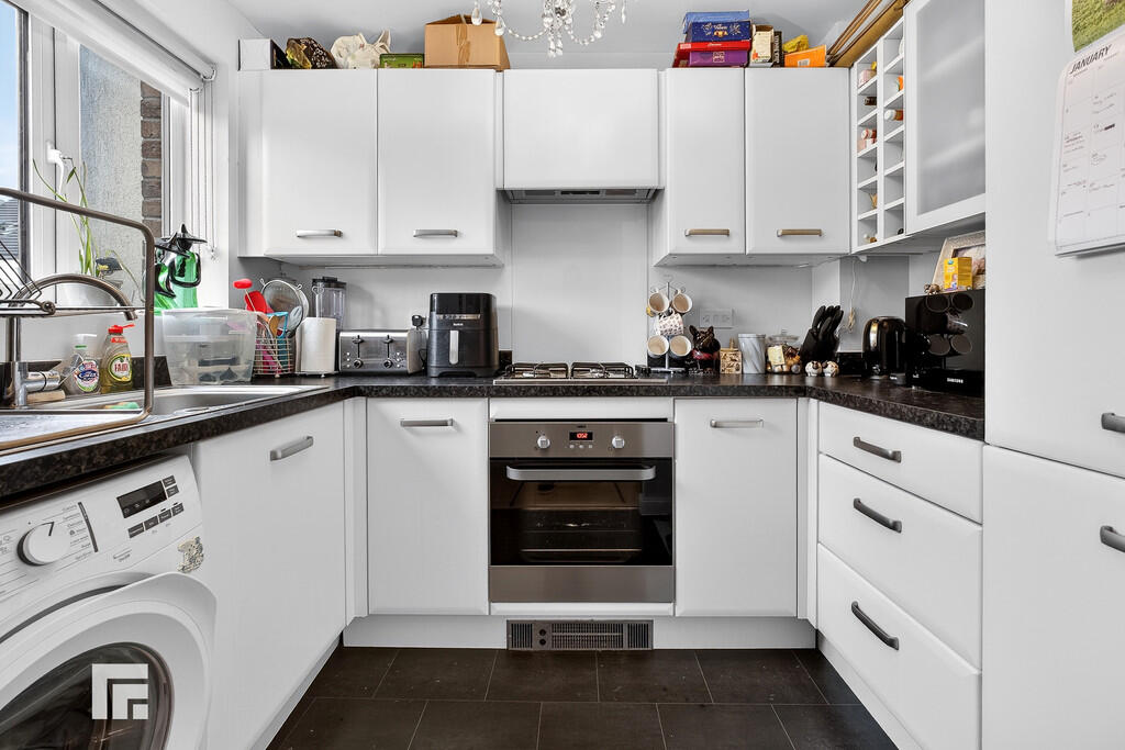 KITCHEN6' 3" x 8' 7" (01.93m x 02.64m) Smooth walls and ceiling with vinyl tile effect flooring. Integrated appliances include a fridge/freezer, an electric oven, a four ring gas hob and an extractor hood. White eye and base level units with complimenting black worktops. A stainless steel sink inset with a stainless steel mixer tap. Space for plumbing and a washing machine. A front aspect window and an extractor fan. Open to the hallway.
