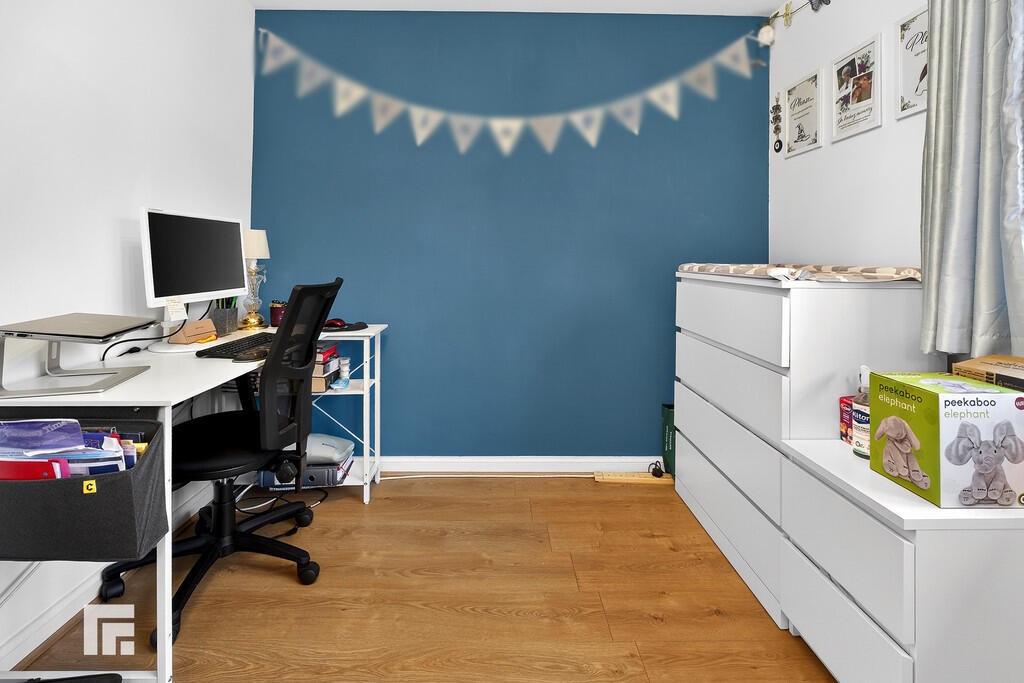 BEDROOMTWO8' 3" x 10' 11" (2.54m x 3.33m) A spacious double bedroom with wood-effect flooring, smooth walls and a smooth ceiling. The room benefits from a rear-aspect window and a radiator, along with ample storage including a built-in cupboard over the stairs and a built-in double wardrobe with sliding doors.