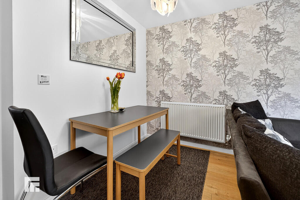 LOUNGE/DINER12' 9" x 15' 1" (3.91m x 4.62m) A light and airy lounge/diner offering ample space for a dining table and chairs. The room features wood-effect flooring, smooth walls with a feature wallpapered wall, and a smooth ceiling. Double-opening French doors lead out to the rear garden. There is a carpeted staircase with a wooden banister rising to the first floor, with useful storage space beneath the stairs, and a radiator.
