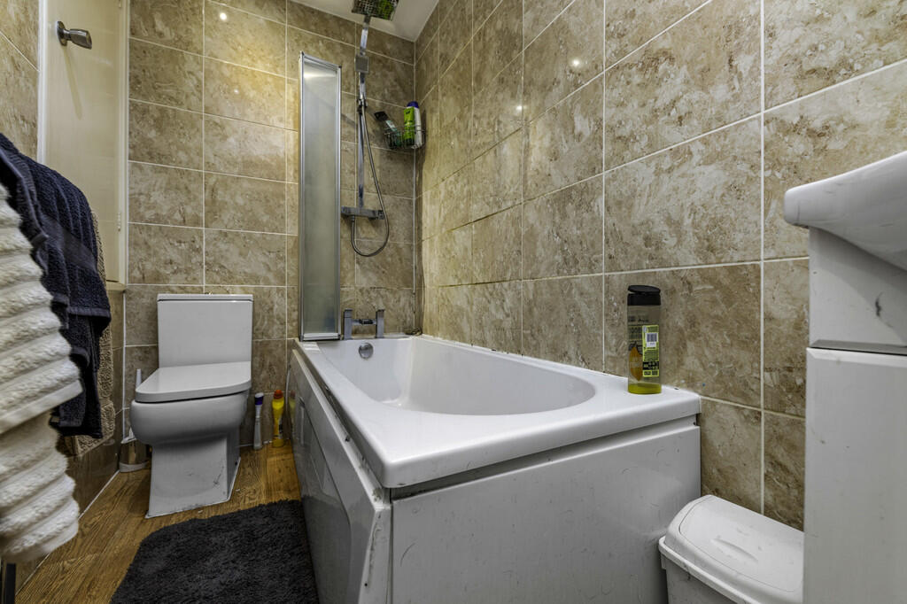 BATHROOM4' 5" x 8' 3" (1.37m x 2.52m) A three piece suite comprising low level wc, pedestal wash hand basin and panelled bath with shower over. Fully tiled walls and floor. Heated towel radiator.