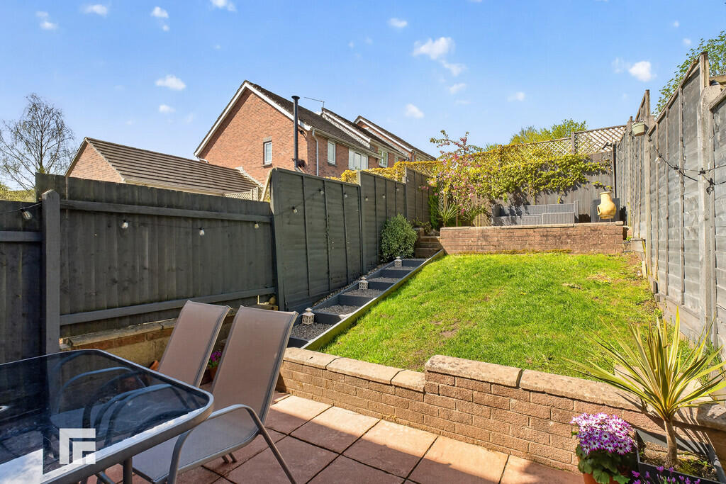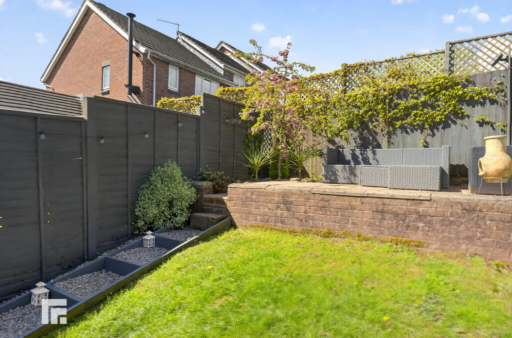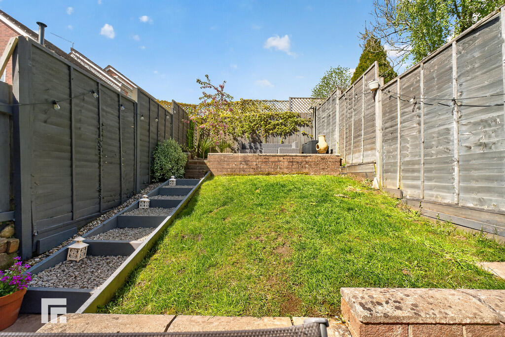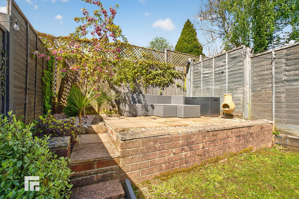 OUTSIDE A lovely, well maintained garden. Paved area. Steps up to further seating area. Lawn.