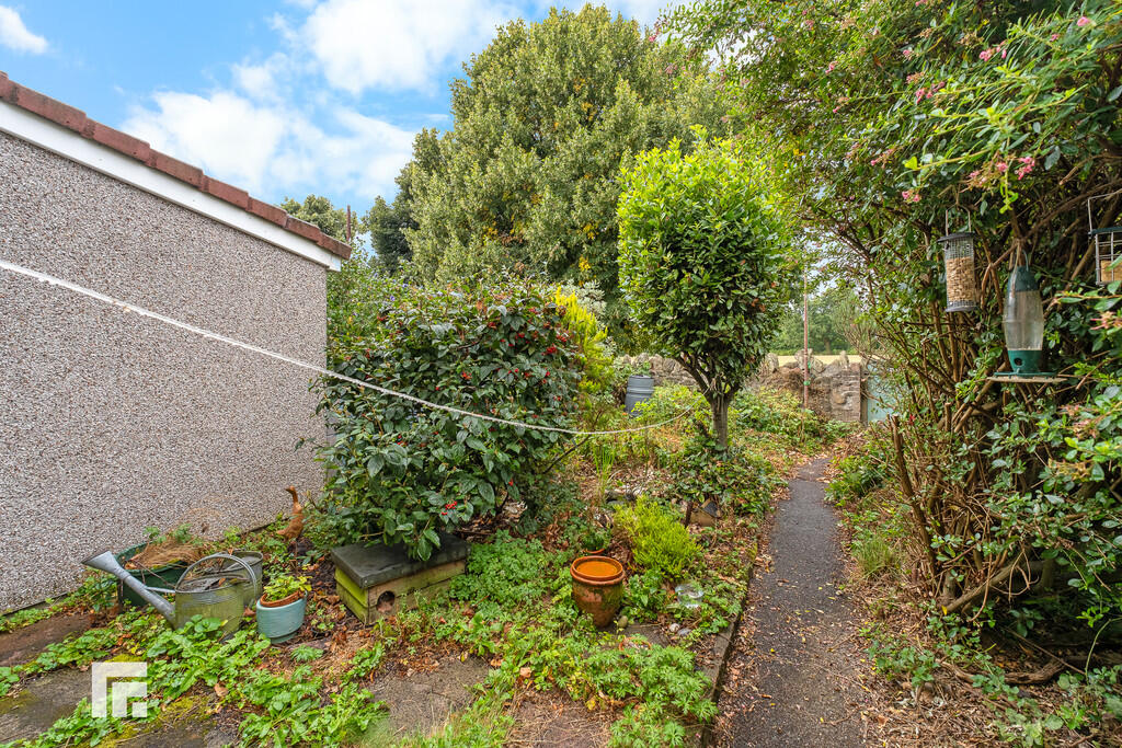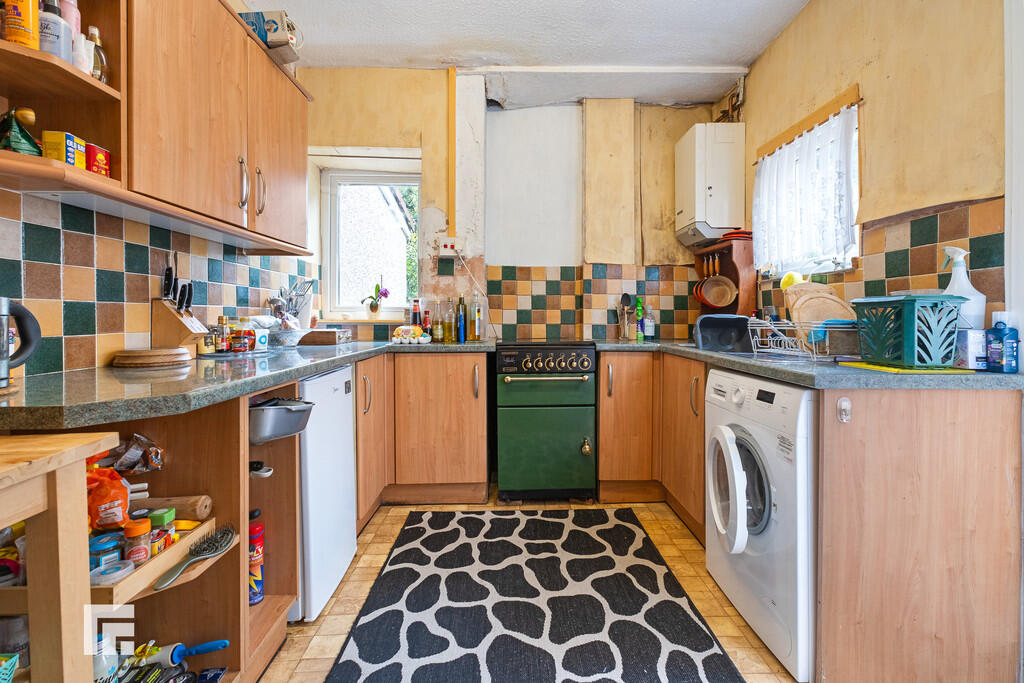 KITCHEN9' 4" x 9' 1" (2.869m x 2.779m) PVC window and PVC door to rear aspect. PVC window to side aspect. Range of base and wall mounted cabinets with contrasting round edge countertop and tiled splash backs. Space for white goods. Freestanding oven. Pantry space. Built-in storage cupboard.