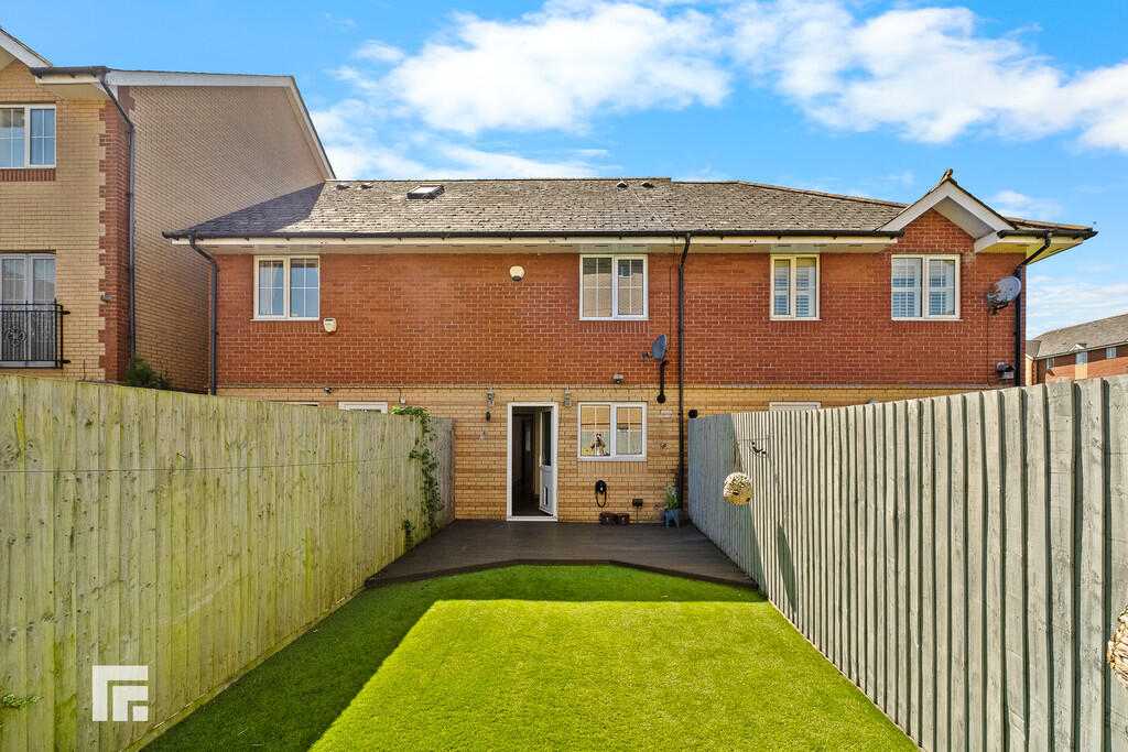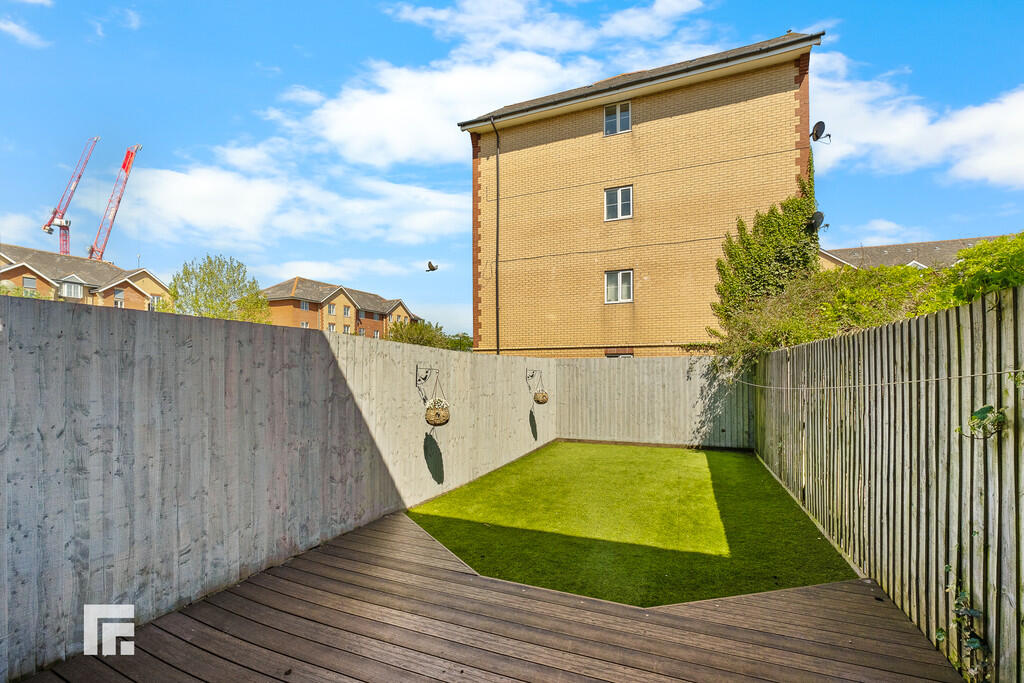 Rear - Laid to decking. Artificial grass. Fence border. Electric power points. Outside tap.