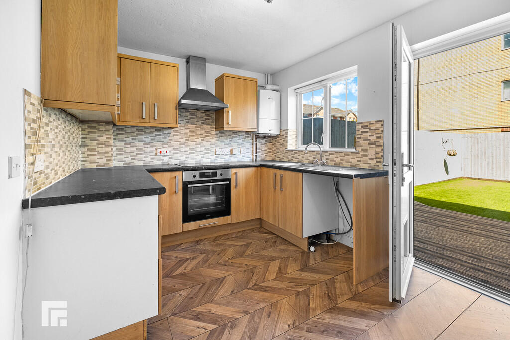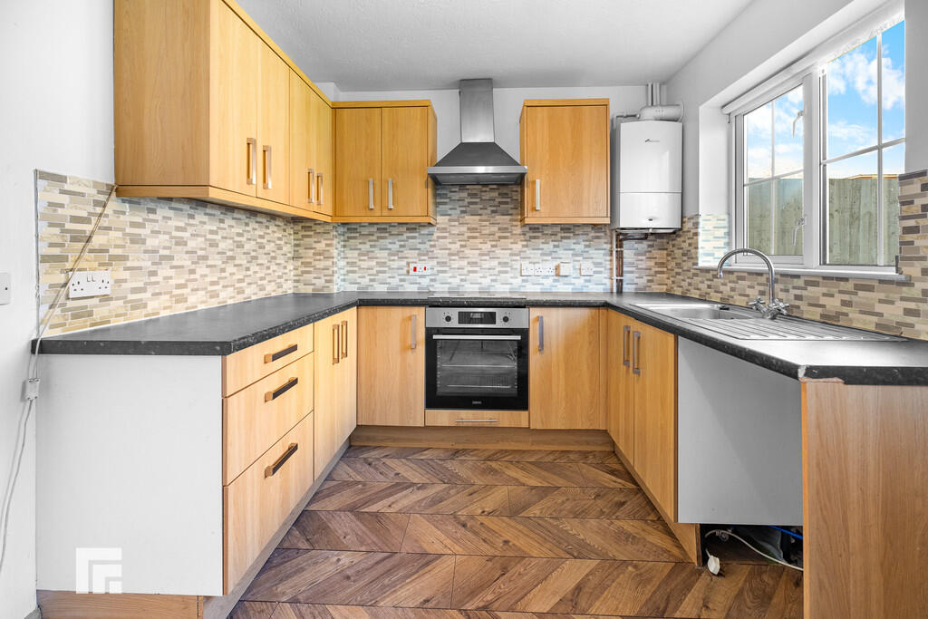 KITCHEN12' 9" x 11' 7" (3.89m x 3.54m) Laminate flooring. Fitted kitchen with a range of wall, base and drawer units with worktops over incorporating stainless steel sink and drainer with hot and cold tap over and electric hob with extractor over and oven beneath. Tiled splashback. Space and plumbing for washing machine and free standing fridge/freezer. Power points. Breakfast bar. Radiator. Pendant light fitting. Double glazed uPVC window to rear aspect. Double glazed uPVC door leading to rear garden.