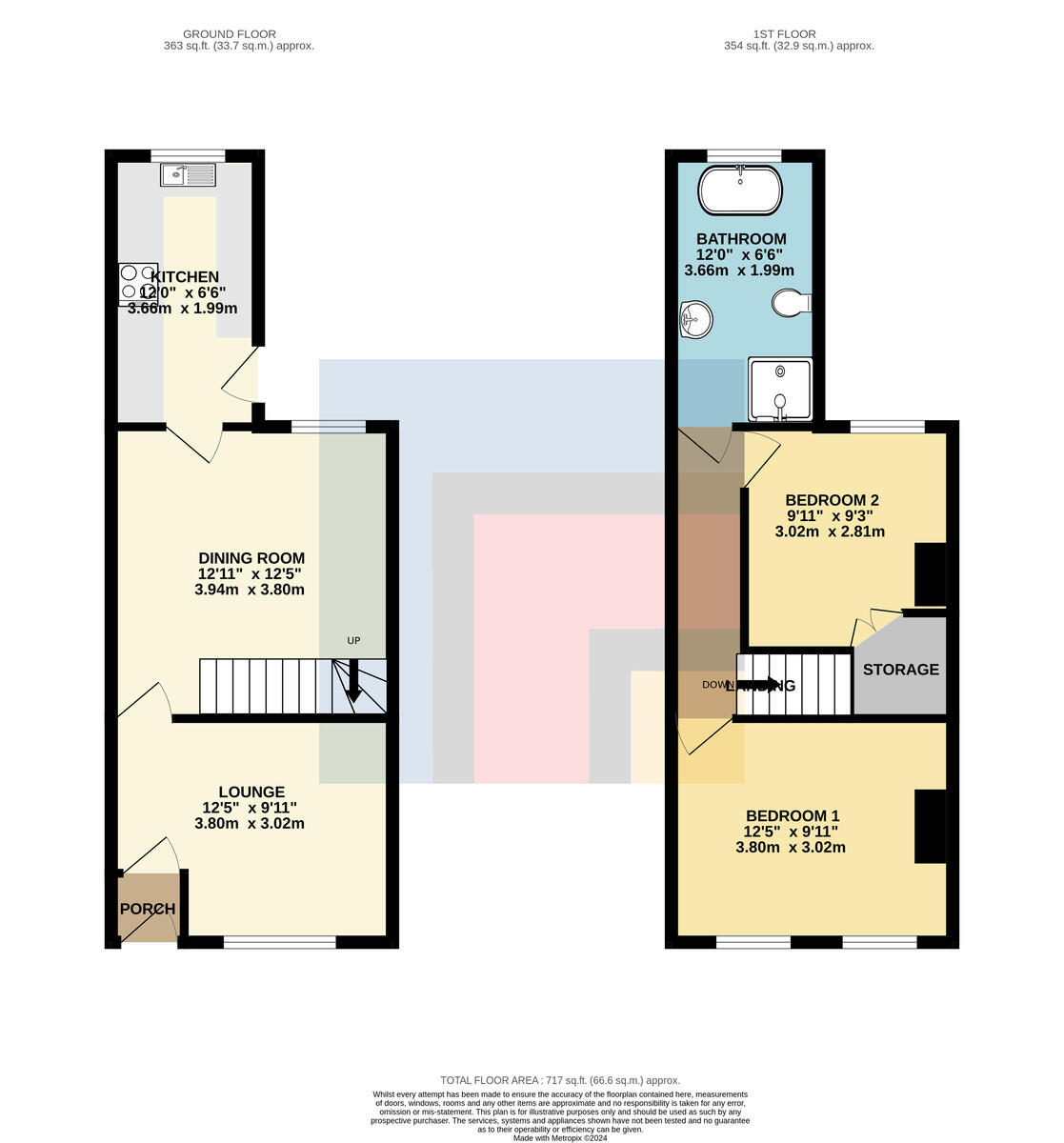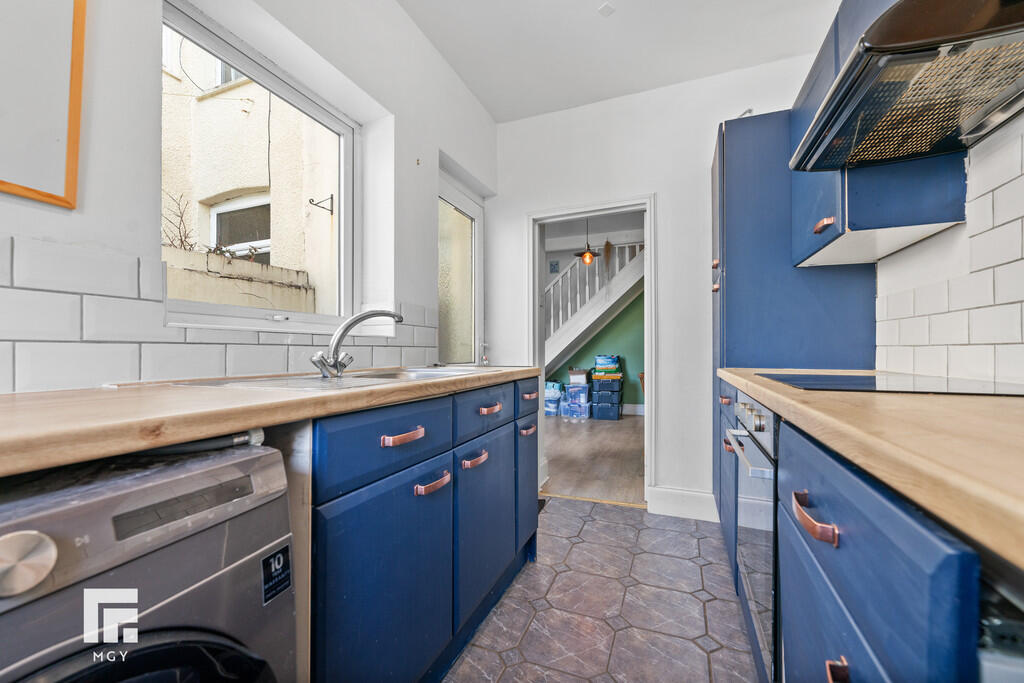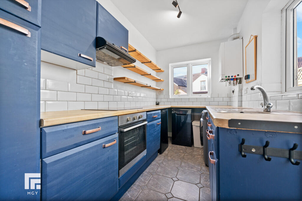 KITCHEN12' 0" x 6' 6" (3.66m x 1.99m) Tiled flooring. Modern fitted kitchen with a range of wall, base and drawer units with worktops over incorporating stainless steel sink and drainer with tap over, and electric hob with oven beneath and extractor above. Tiled splashback. Space for appliances. Wall mounted boiler. Two double glazed windows to rear aspect. Power points. Door leading to rear garden.