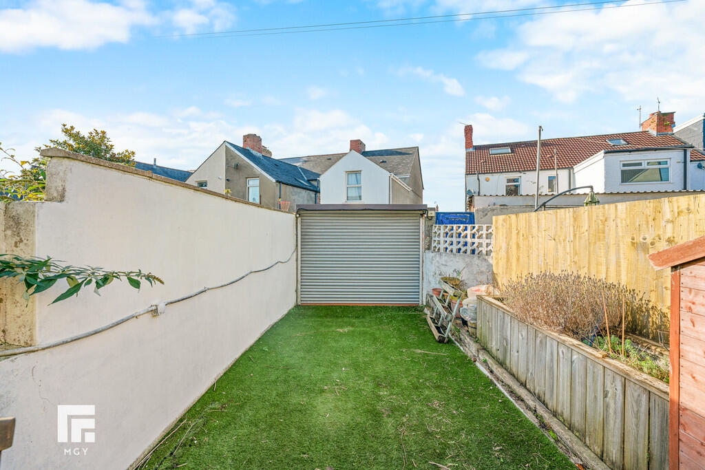 GARDEN Laid to pebbled area with stepping stone tiles. Decking. Wall and fence border. Artificial lawn to far end. Roller shutter door.