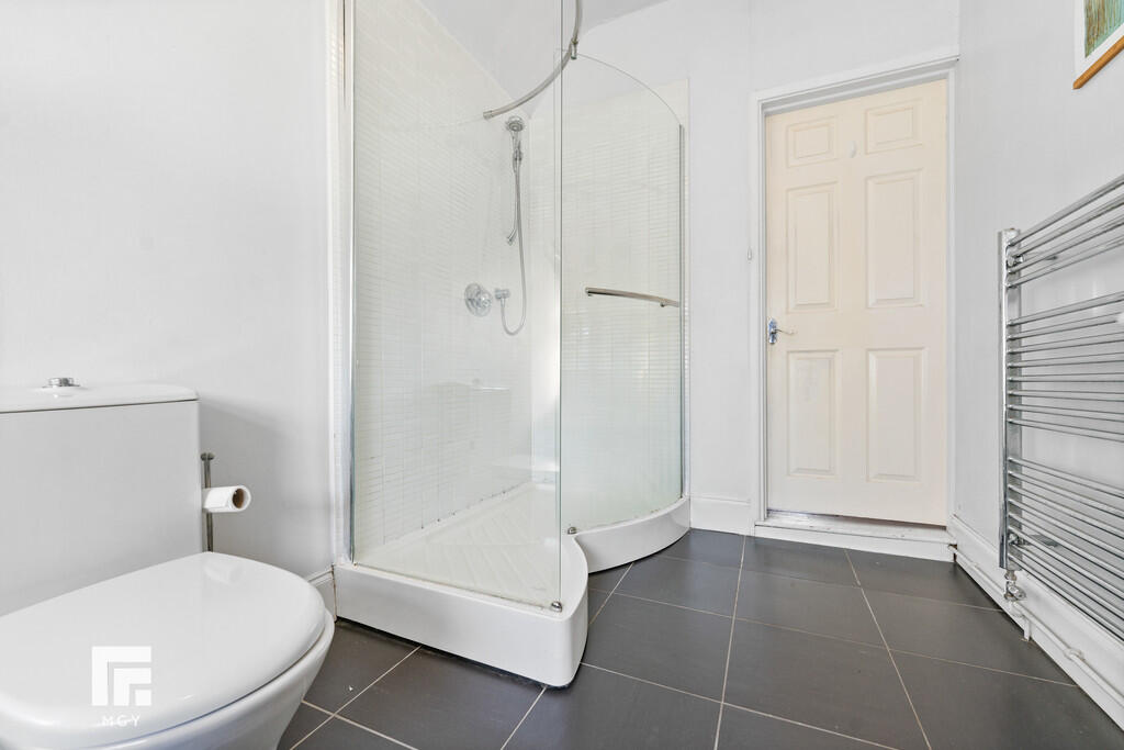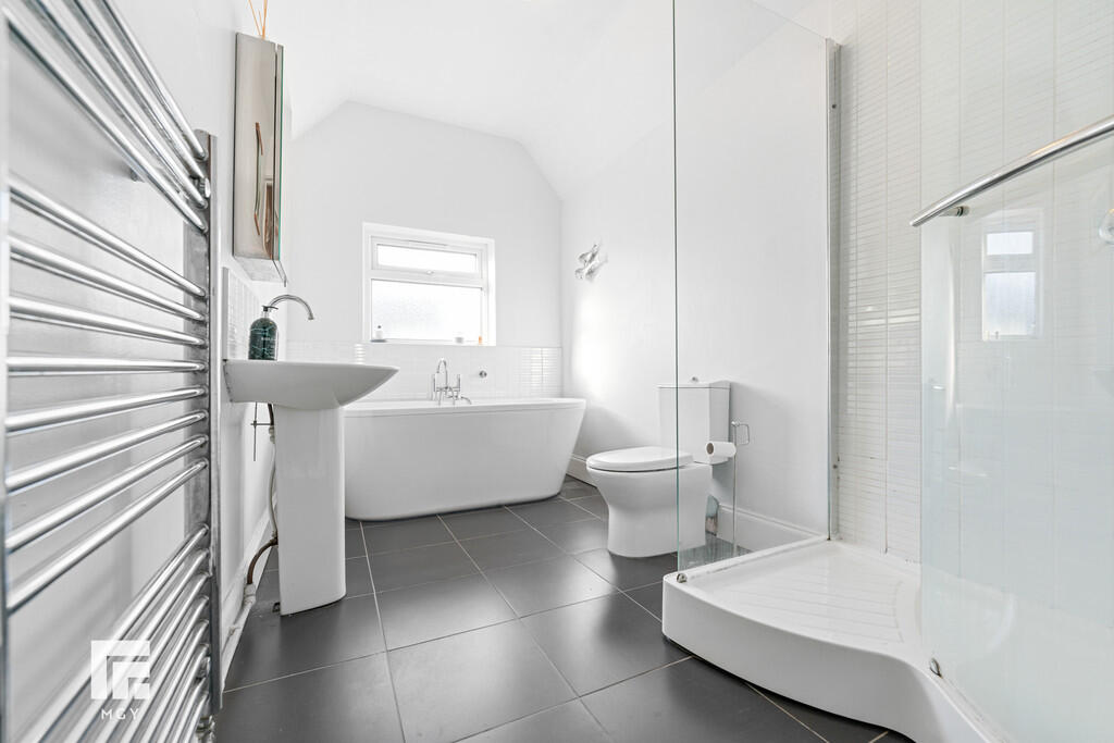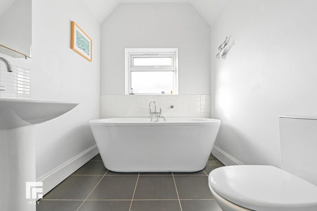 BATHROOM12' 0" x 6' 6" (3.66m x 1.99m) Tiled flooring. White three-piece-suite comprising WC, pedestal wash hand basin with hot and cold tap over, and free standing bath with mixer tap over with additional handheld shower attachment. Walk in shower cubicle with mains powered shower over. Partially tiled walls to shower cubicle. Chrome heated towel rail. Obscure window to rear aspect. Pendant light fitting. Extractor fan.