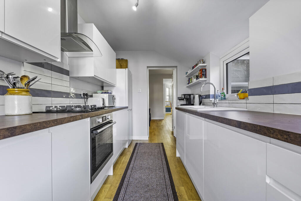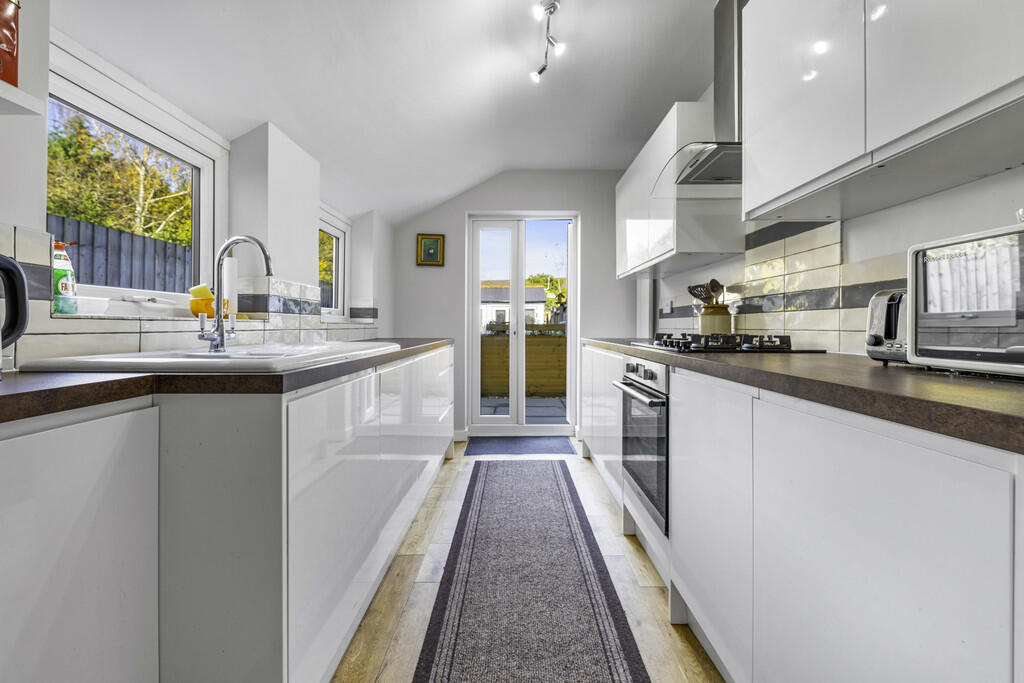 KITCHEN13' 0" x 7' 2" (3.983m x 2.194m) Two double glazed windows to side. Wooden oak flooring. range of modern white gloss. Wall and base units with work surface incorporating white enamel sink and drainer with mixer tap over. Gas hob, electric oven and stainless steel extractor fan above. Integral washing machine and dish washer plus space for fridge freezer. Tiled splash backs and spotlights to ceiling.
