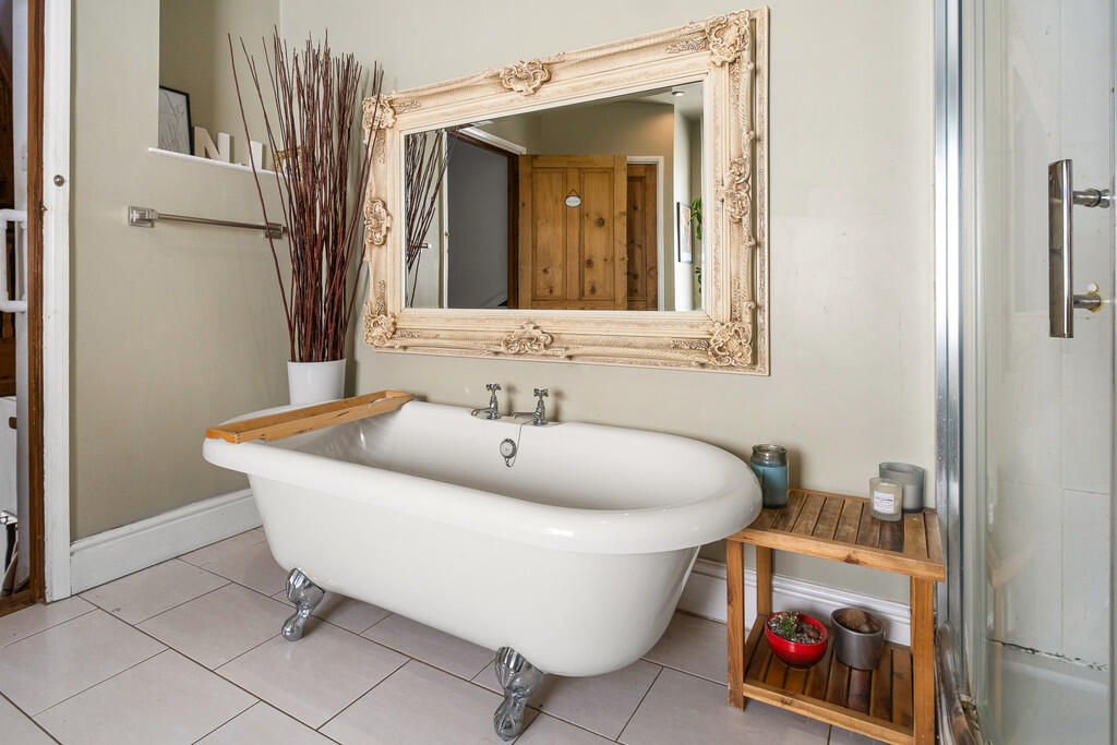 BATHROOM10' 5" x 10' 1" (3.20m x 3.08m) Tiled flooring. Free standing roll-top bath with hot and cold tap over. Walk in shower cubicle with mains powered shower over. Pedestal wash hand basin with hot and cold tap over. WC. Obscure double glazed window to rear aspect. Radiator. Door to storage cupboard. Spotlights.