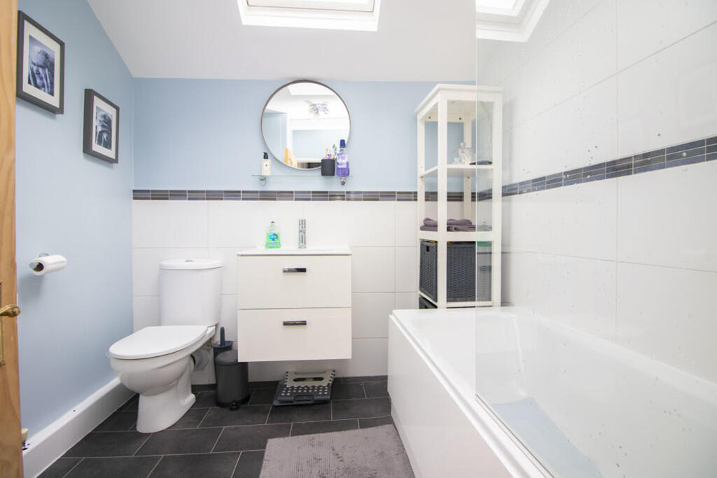 BATHROOM7' 8" x 5' 11" (2.35m x 1.81m) A good size family bathroom, with obscure double glazed window to side. Sky light. Tiled flooring. Part tiled walls. Panelled bath, with shower over and glass shower screen. Vanity enclosed wash hand basin. W.C. Storage cupboard housing Combi boiler. Wall mounted radiator.