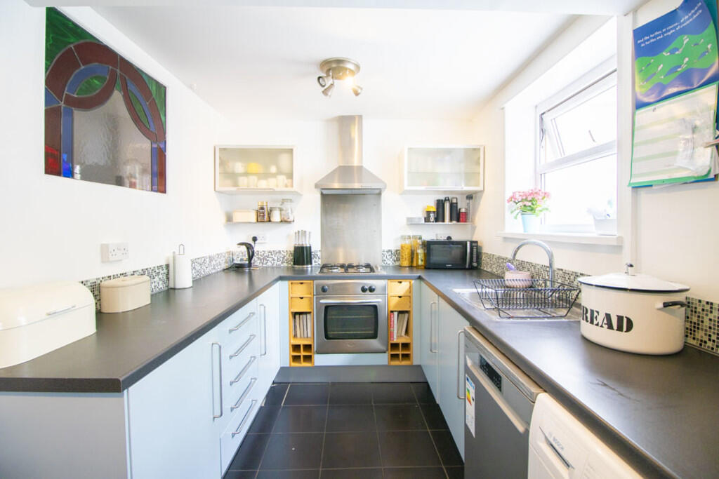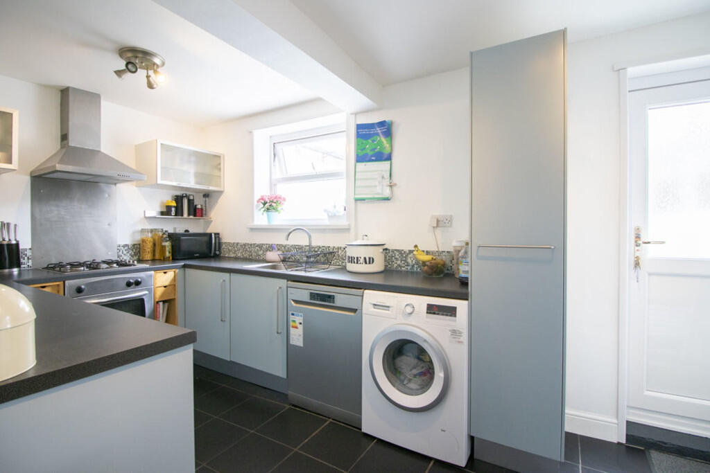 KITCHEN13' 8" x 7' 8" (4.17m x 2.35m) Double glazed uPVC windows and door leading to rear garden. Modern fitted kitchen, with wall and base units and work surfaces incorporating stainless steel sink. Tiled flooring. Part tiled walls. Built in oven, with four ring gas hob and stainless steel extractor hood over. Splash back. Space for washing machine, dishwasher and fridge freezer. Wall mounted radiator.