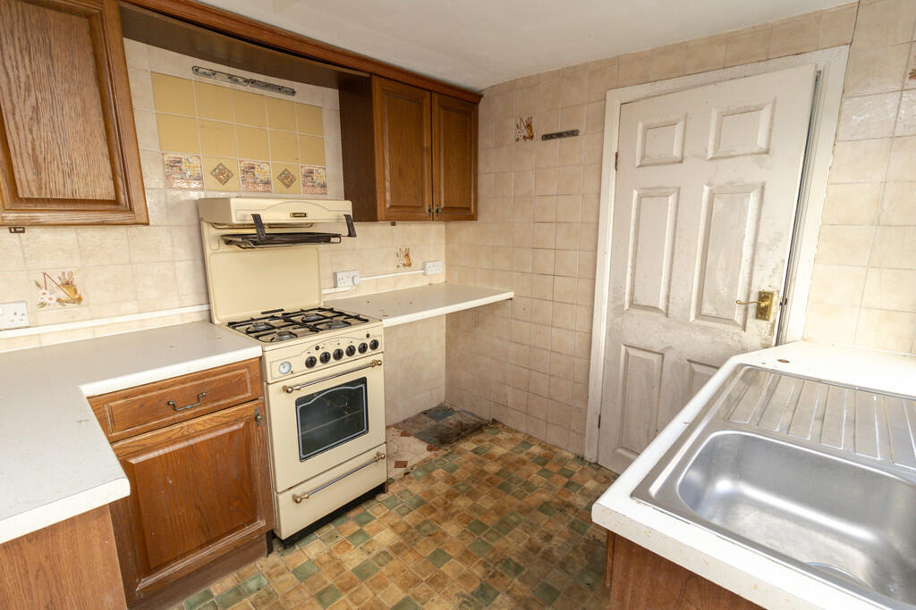 KITCHEN8' 5" x 7' 8" (2.58m x 2.34m) Range of base and wall units with worktops over incorporating stainless steel sink and drainer with hot and cold tap over. Tiled splashbacks. Obscure window to rear. Strip light. Door with partial obscured glass leading to rear garden. Power points. Door to bathroom.