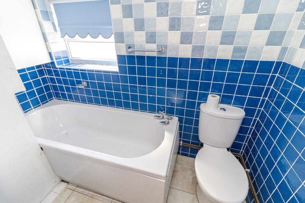 BATHROOM6' 11" x 3' 6" (2.11m x 1.08m) White three piece suite comprising panelled bath with hot and cold tap over, WC, and wall mounted sink with hot and cold tap over. Tiled walls. Obscure window to rear. Tiled flooring. Wall mounted storage cabinet. Pendant light fitting.
