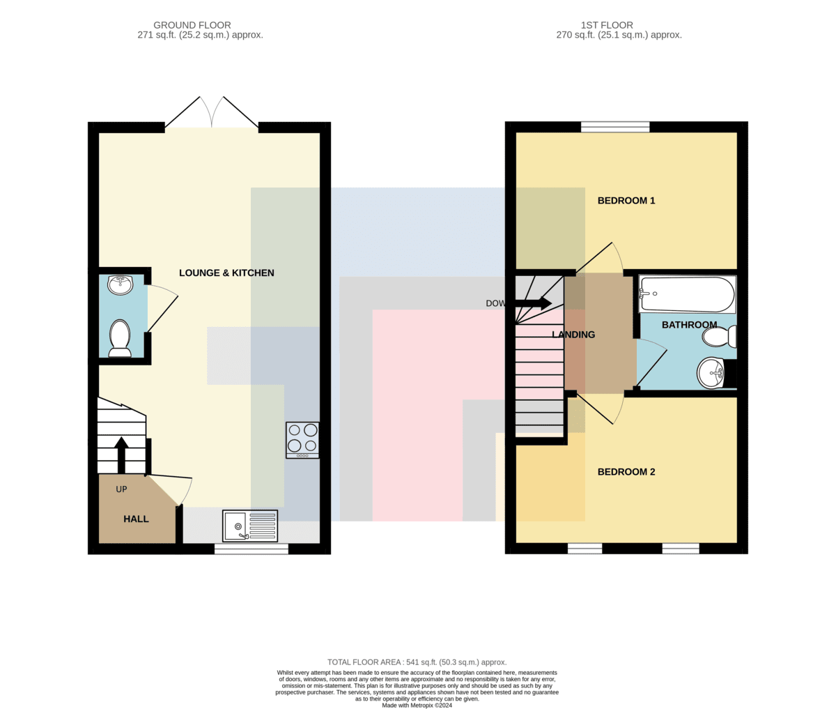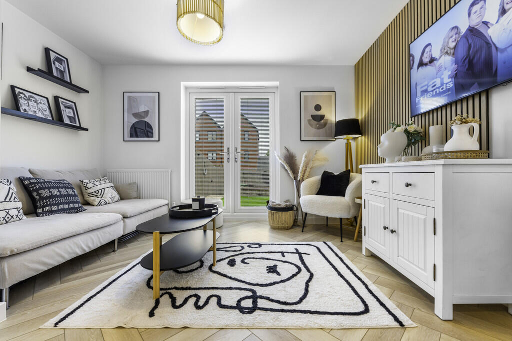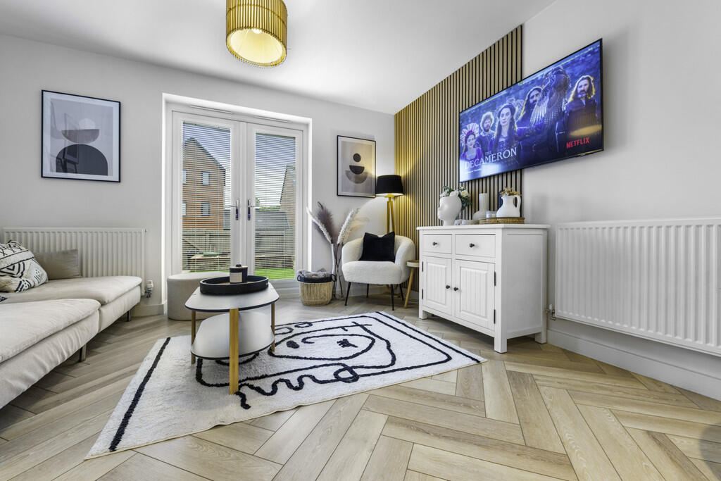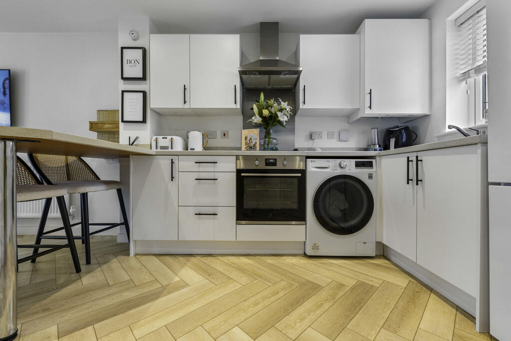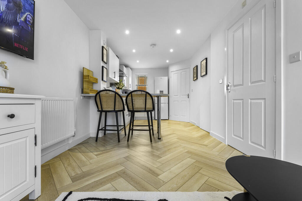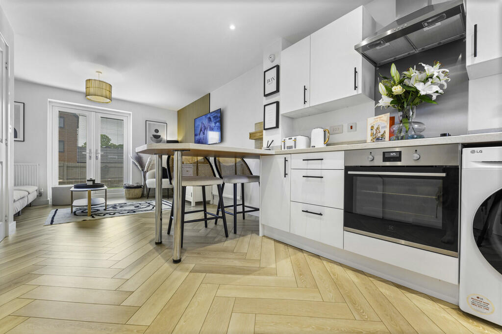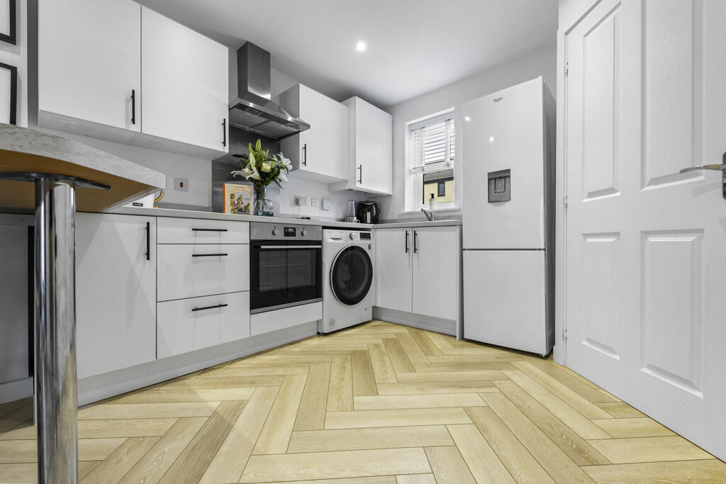 LOUNGE/KITCHEN22' 1" x 8' 8" (6.74m x 2.66m) A spacious open plan lounge/dining/kitchen area. Contemporary, beautifully decorated lounge area. Patio door leading into the well maintained rear garden. Appointed along two walls, modern white eye and low level cupboards beneath laminate worktops with black handles. One and a half bowl stainless steel sink with mixer tap, integrated electric hob, oven, extractor fan. Space for fridge freezer. Concealed ideal logic combi boiler. Breakfast bar. Quality LVT flooring. Spotlights. Two radiators. Under-stairs storage cupboard. Window to front. Door to cloakroom.