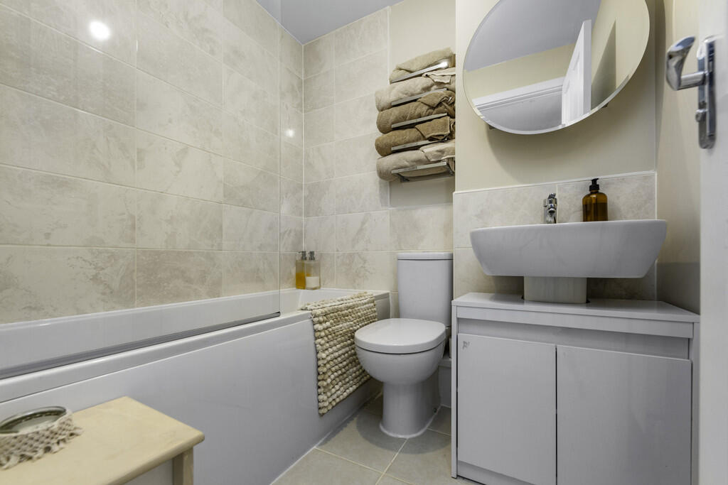 FAMILYBATHROOM6' 0" x 5' 6" (1.83m x 1.70m) A modern white suite; low level WC, pedestal wash hand basin, bath with chrome mixer tap, chrome shower, tiled splashbacks and flooring. Extractor fan. Radiator.