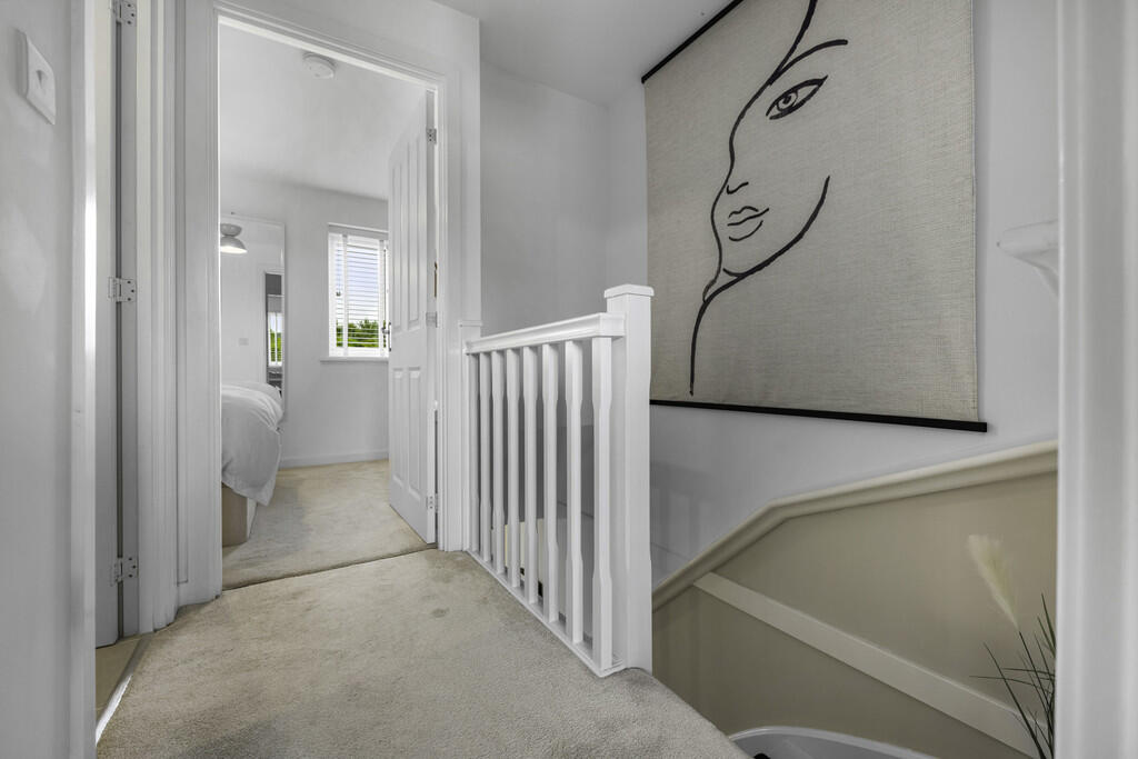LANDING A light, airy landing space, wooden, painted banister. Doors leading bedrooms to all rooms.
