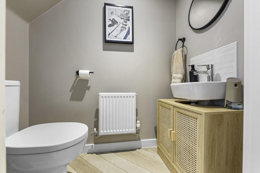 CLOAKROOM5' 4" x 2' 10" (1.63m x 0.88m) Modern white suite; low level WC, wash hand basin, extractor fan, tiled splashback, radiator. LVT flooring.