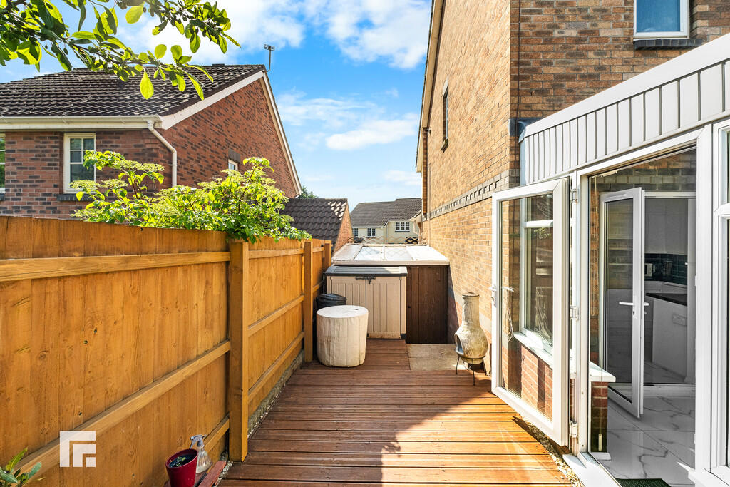 REAR GARDEN - Lawn area. Fenced boundary. Deck area. Stairs down to garage space