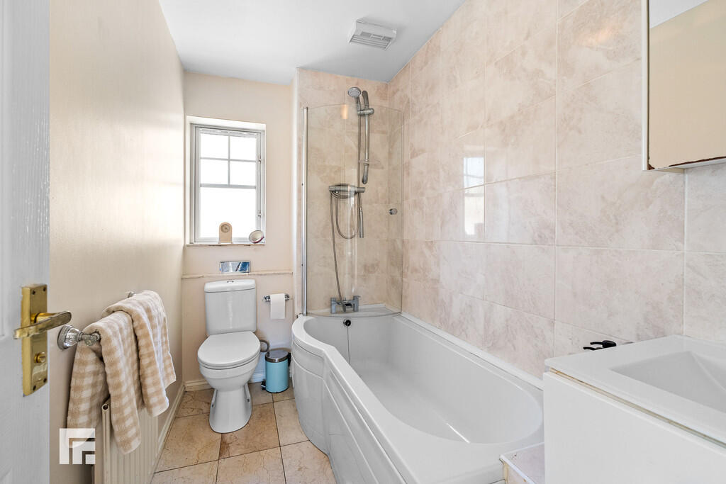 BATHROOM8' 11" x 5' 0" (2.732m x 1.546m) PVC window with obscure glass to rear aspect. Vent. WC with inset flush. Wash handbasin with step. Vanity unit with mirrored wall mounted cabinet. Bath unit with shower above. Radiator. Marble Tiles.