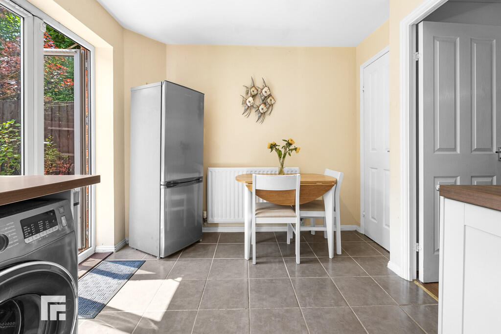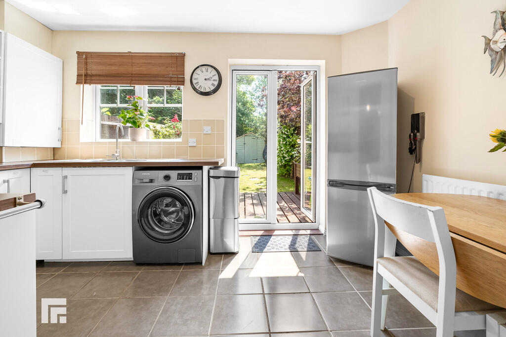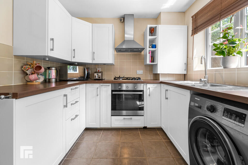 KITCHEN12' 11" x 8' 7" (3.948 m x 2.617 m) PVC door to rear garden. PVC window to rear aspect. A range of base and wall mounted cabinets with contrasting round edge countertops. 4 Ring gas hob with integrated over below and extractor fan above and integral oven below. Tiled splashback. Radiator. Built-in storage space under stairs.