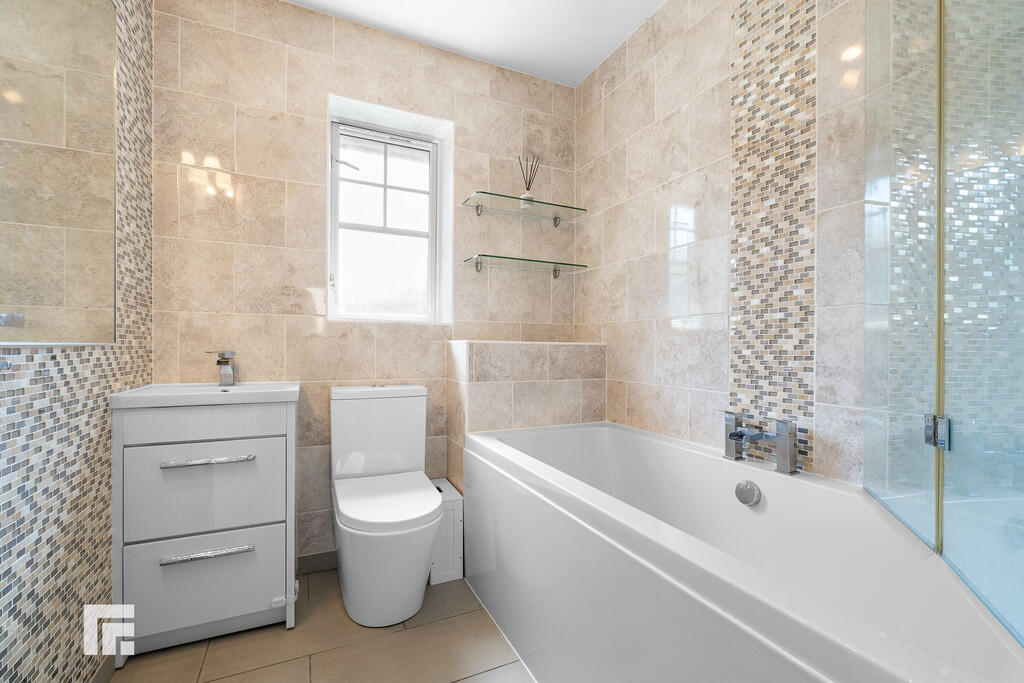 BATHROOM6' 6" x 6' 2" (1.987 m x 1.896 m) PVC window with obscure glass to rear aspect. Tiled walls. Three-piece suite including, wash handbasin vanity unit, WC with inset flush, bath unit with showerhead above. Extractor fan.