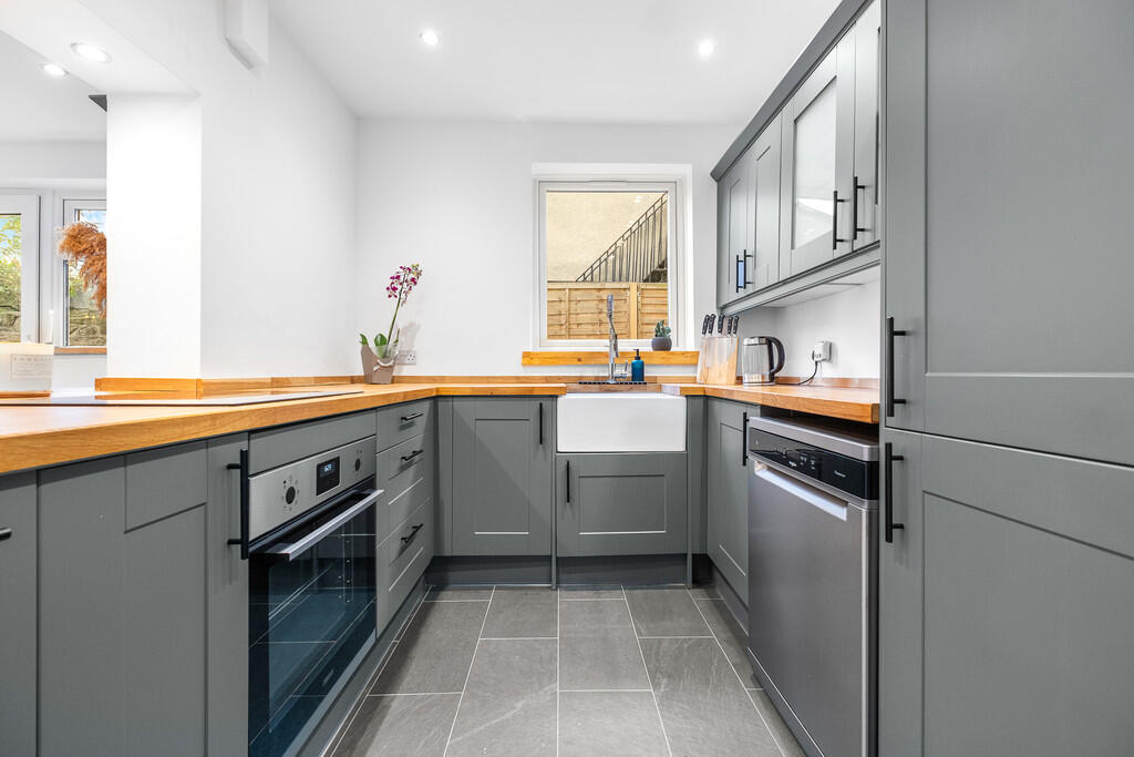 KITCHEN11' 0" x 7' 11" (3.371m x 2.420m) uPVC double glazed window to side aspect. A range of base and wall mounted cabinets with contrasting square edge oak countertops. Integrated fridge freezer, oven with induction hob above. Inset ceramic Belfast sink. Modern vertical radiator. Spotlights. Dishwasher.