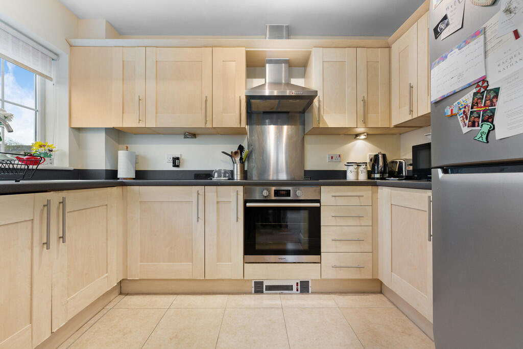 KITCHEN11' 1" x 5' 11" (3.40m x 1.82m) Upvc double glazed window to side. Ceramic tiled flooring. Range of fitted base and wall units with work surface incorporating stainless steel sink unit with mixer tap. Electric oven with inset electric hob over with stainless steel splashback and extractor fan over. Recess for fridge freezer. Integrated washing machine.