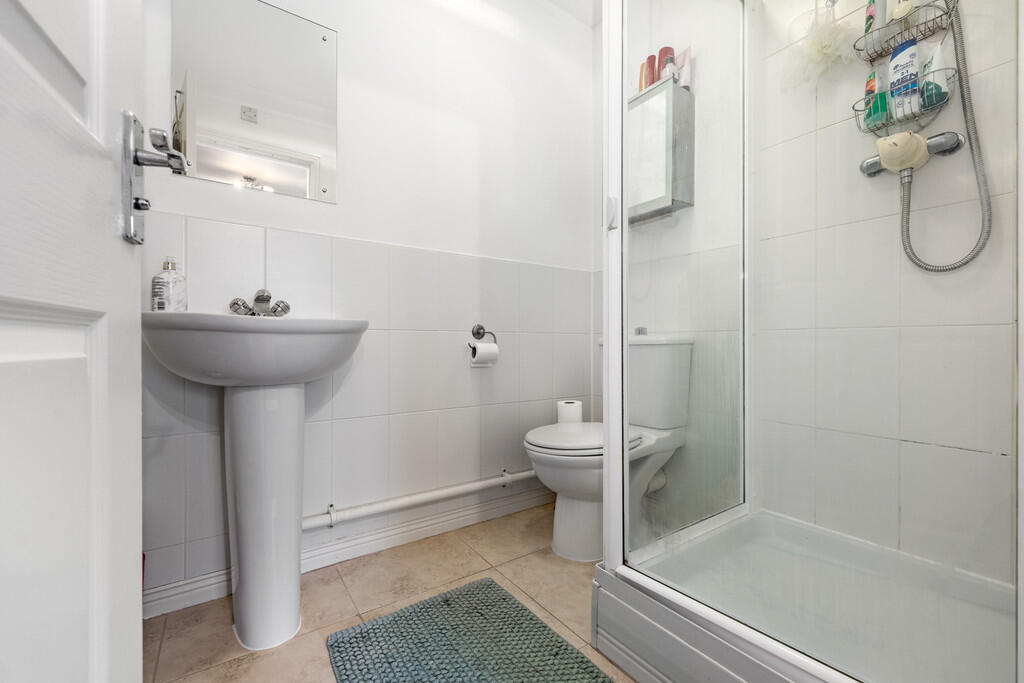 ENSUITE Ceramic tiled flooring and part tiled walls. Three piece bathroom suite comprising corner tiled shower cubicle, pedestal wash hand basin and wc. Electric heated towel rail. Shaver point. Extractor fan to ceiling.