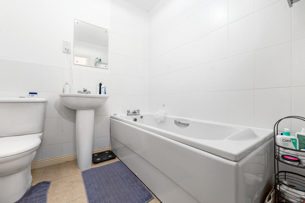 BATHROOM Part tiled walls. ceramic tiled flooring. Three piece suite comprising panelled bath, pedestal wash hand basin and wc. Heated electric towel rail. Shaver point. Extractor fan to ceiling.